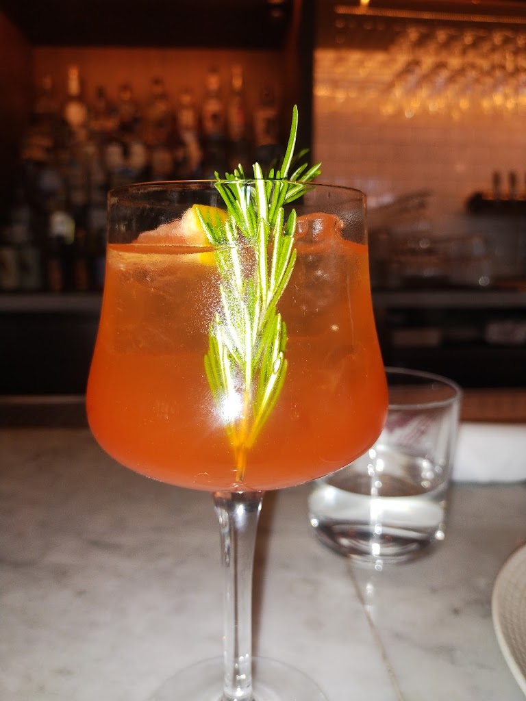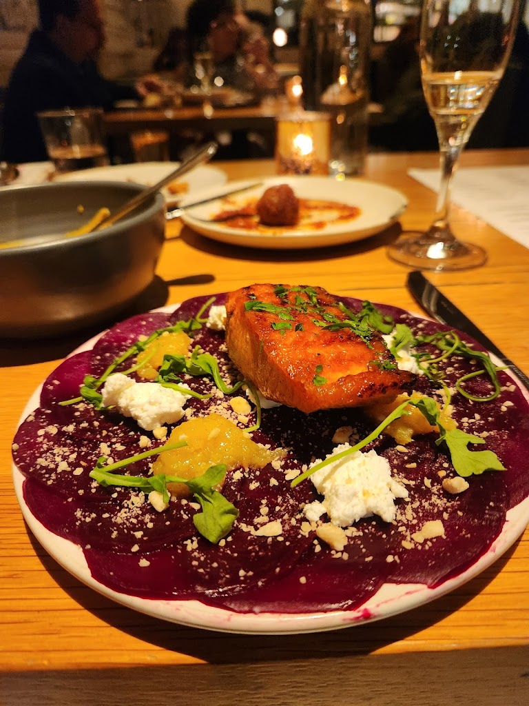 I went with the beet carpaccio (which our server sweetly explained, although with our food network obsession, we already knew 😉) which had orange marmalade, goat cheese, hazelnut, and arugula, and I added a medium salmon. If you can't tell from the photos, we were over the moon. I also ordered a TR Spritz (aperol, cava, ginger, lemon, rosemary, grapefruit) to go along with it.