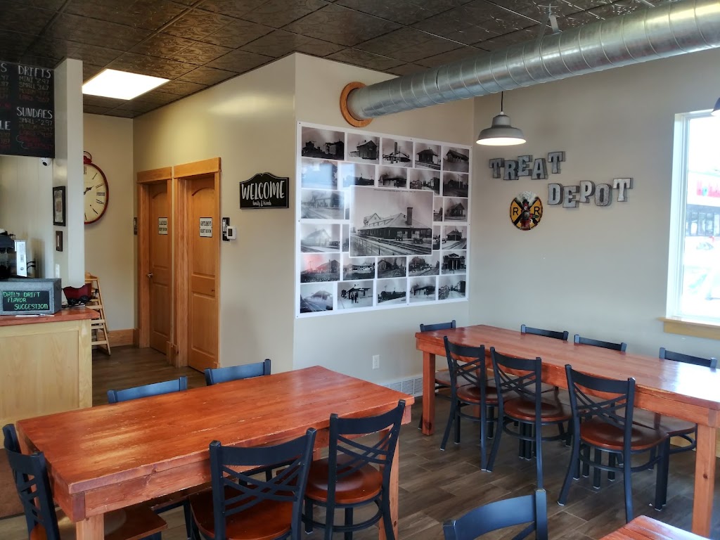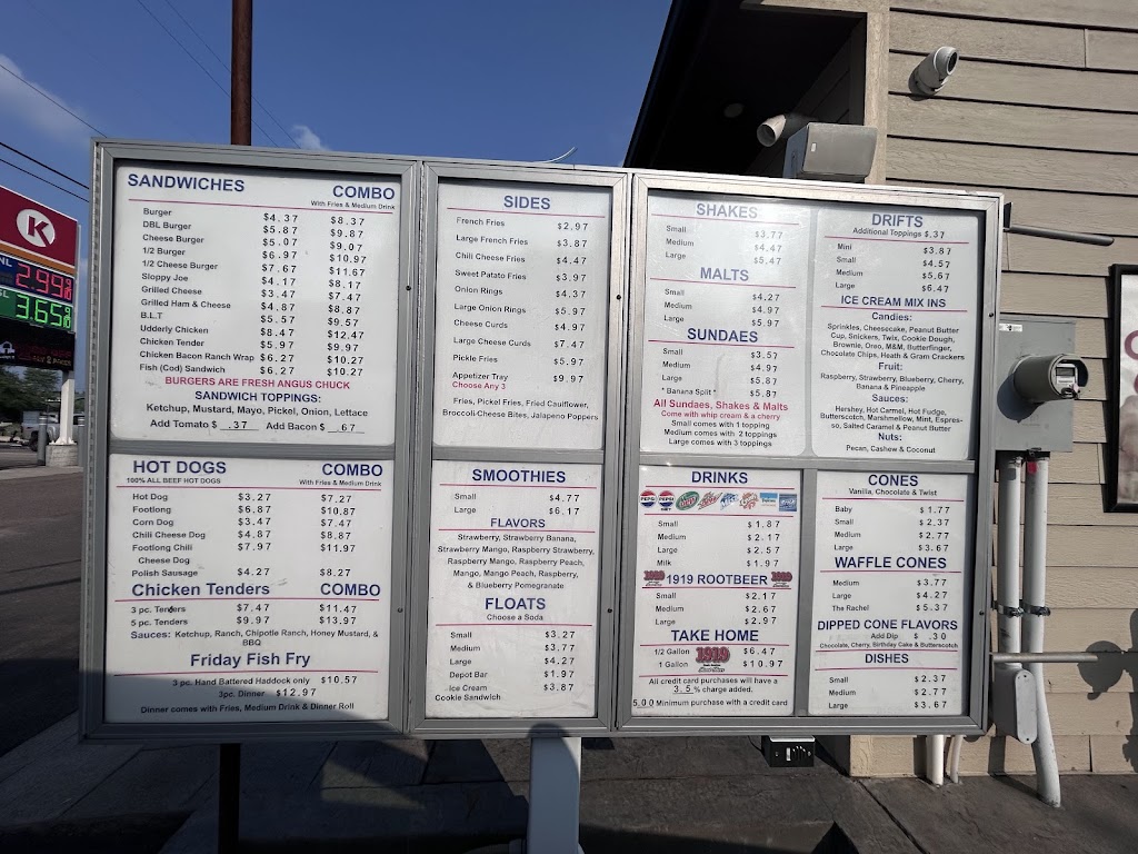 Ice cream products including cones, dipped cones, sundaes, banana splits, DRIFTS (delicious soft serve with your choice of candies, cheesecake, fruits, brownies, etc.) shakes, malts, Depot bars of multiple flavors and many more ice cream products.