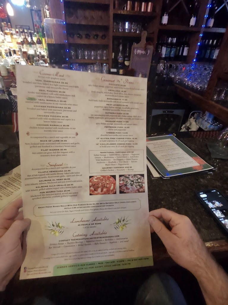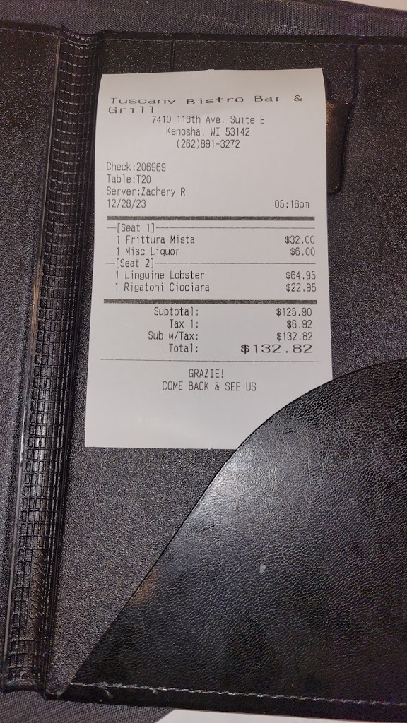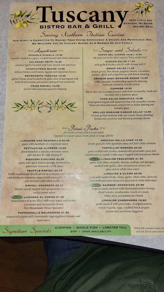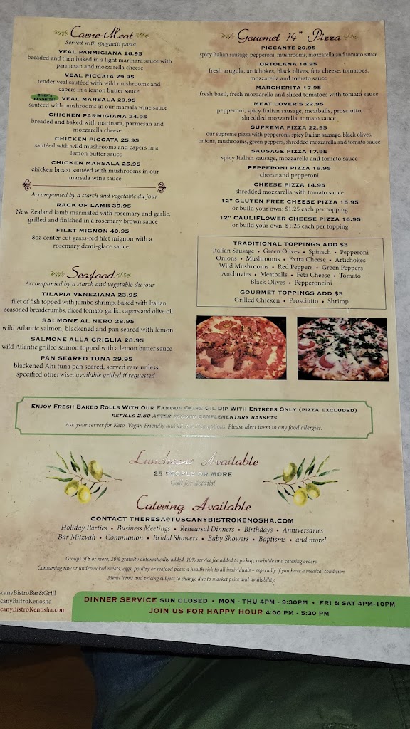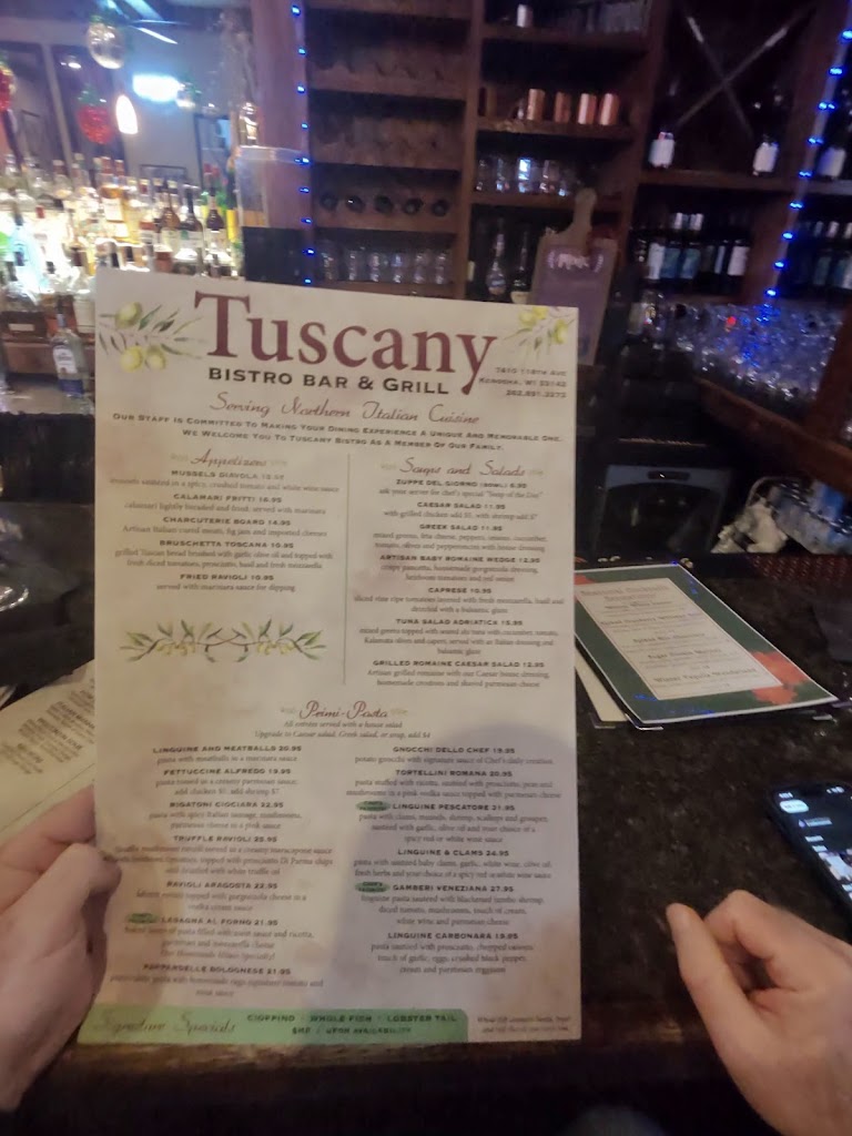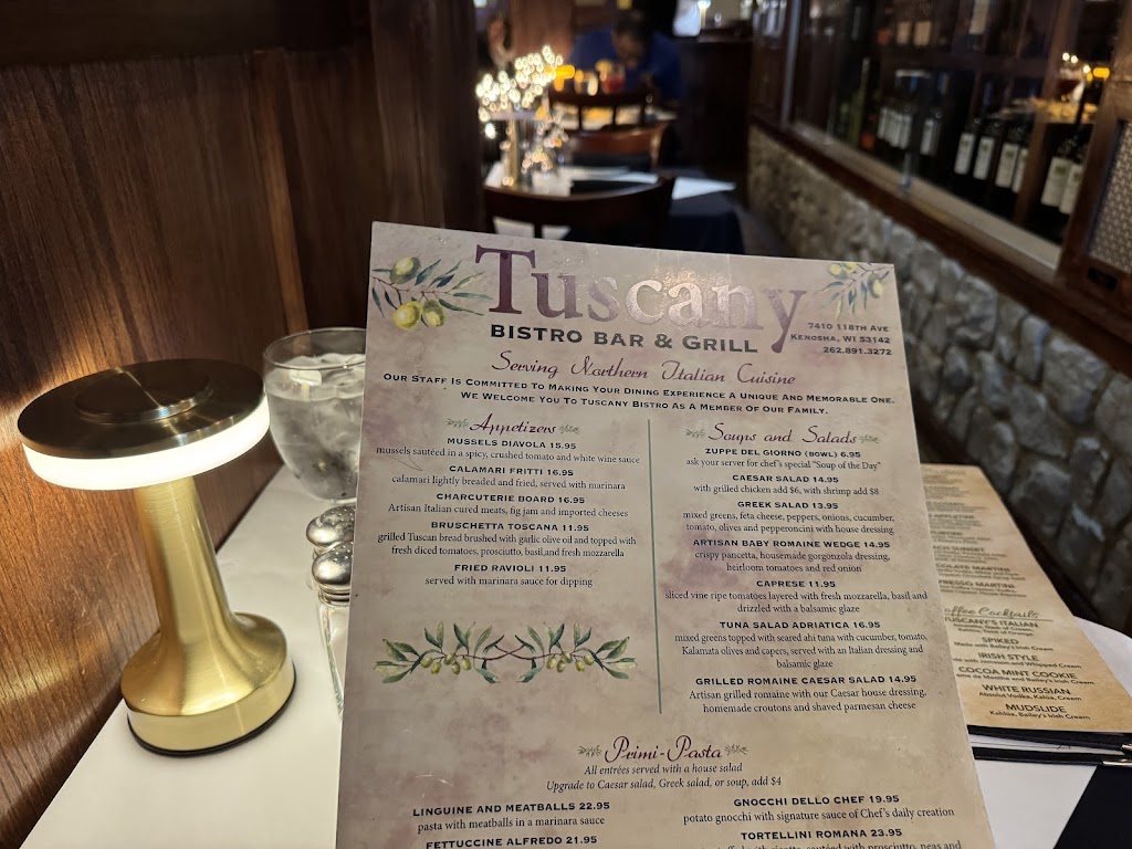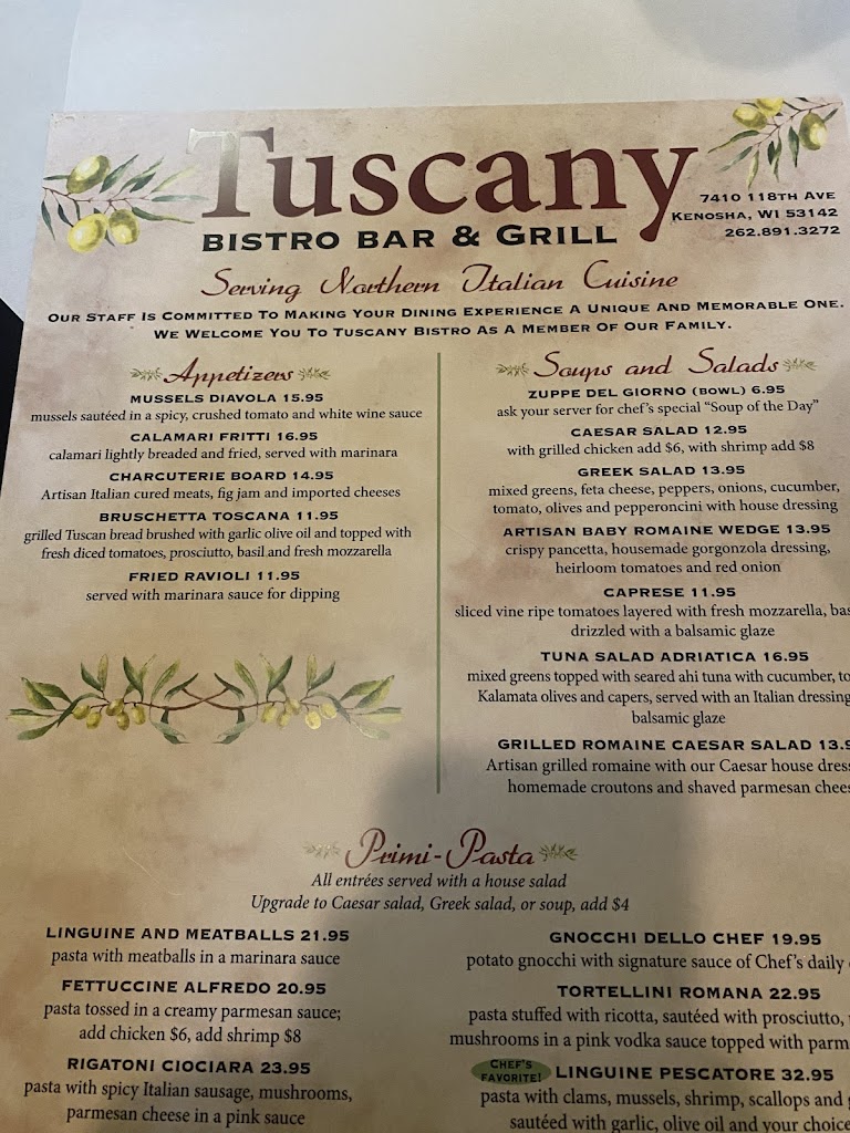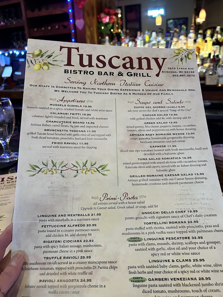 An absolute delight. Had a wonderful anniversary dinner, Tuscany did not disappoint. Our Server Adele met us with a candle lit table and a cute anniversary sign on the table. We had the mussels, the lamb, the pescatoria pasta. Everything was delicious. Don’t sleep on the home made olive oil and bread! The ambiance was also great and the cherry on top was a rich and creamy tiramisu to wrap things up. Don’t miss out on this lovely jewel in Kenosha! Would definetly come back