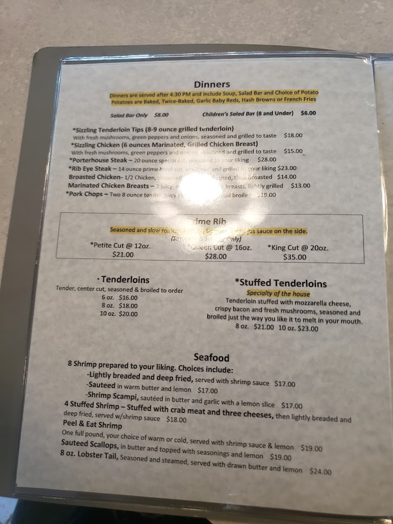 Dinner was good,I had beef tips. Other people in my party had prime rib and said it needed seasoning. Service was good. Be advised this is a supper club, so you order at the bar and when your food is just about ready they seat you. They have a great salad bar that thay constantly care for.
