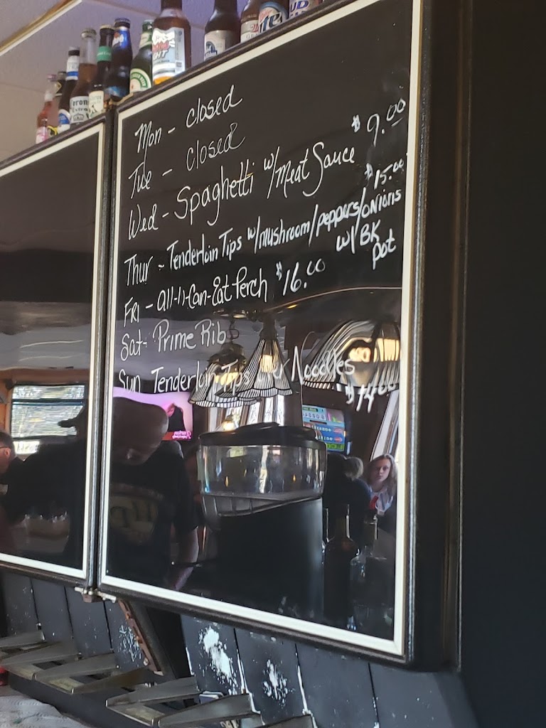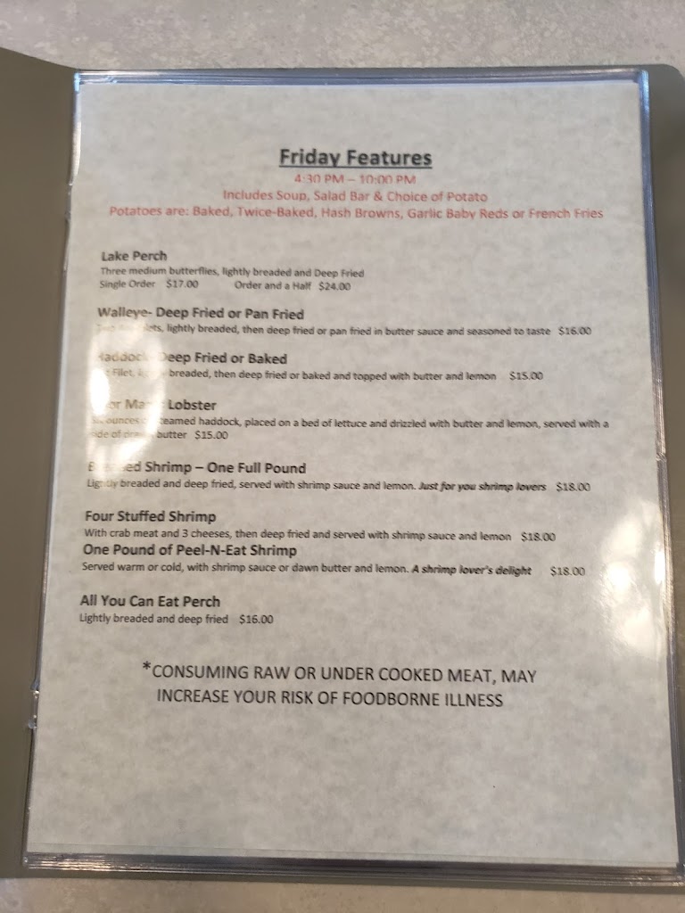 It is now July 2024. We stopped - actually rushed to get here early on a Friday because we were told they could sell out for fish fry. Wished we came much later and they had. We were the first ones in the dining area. Wife ordered steak and said it was good. I ordered the deep fried haddock and it sucked. Tastes like old cardboard. Two other couples came in right after us. One coupled ordered baked and fried haddock and both said it tasted like it had been frozen way too long. Other couple ordered perch and spaghetti. Both left with hardly touching their plates. Said on the way out they would eat dinner at home. This place went down the toilet. Bar is fine, just eat elsewhere. Extremely disappointed. The cook, manager, owner, or waitress NEVER came out and apologized. Just charged us full amount of the bill. Other couples were pissed. They blamed it on their supplier.