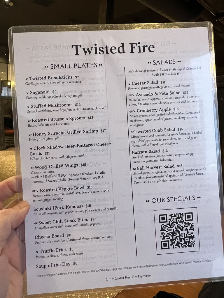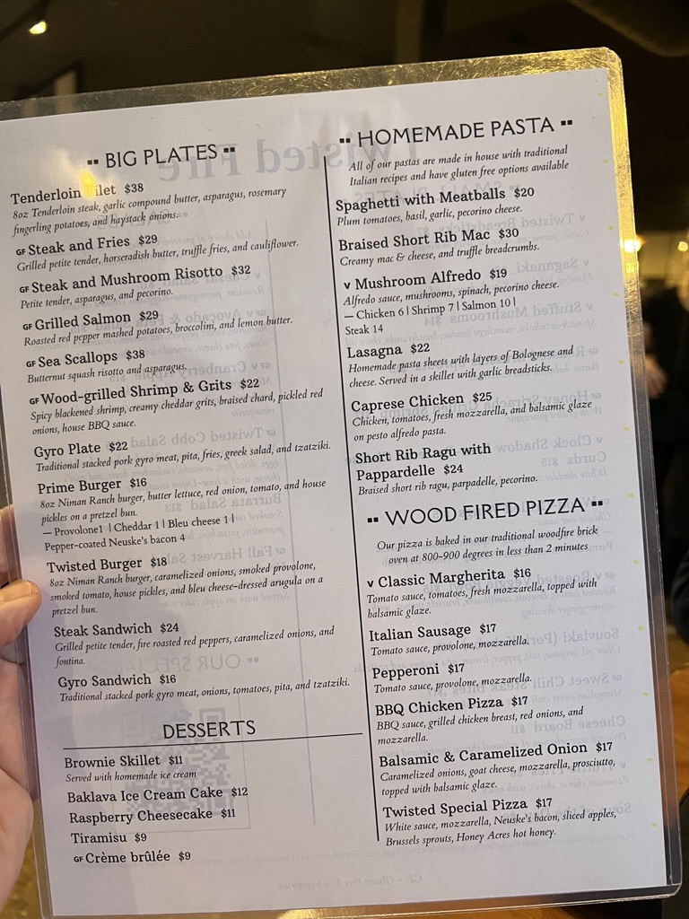 Our first date night after the holidays. Choose twisted fire to try. Was not let down at all. We had as an appetizer the flatbread ith marinara. Was quite a well executed dish. Excellent marinara and the bread was the perfect dipping instrument. I ordered the blackened shrimp and grits, my GF had the filet. Both dishes were delicious. The filet was served perfect. The wood did impart flavor into the filet. The grits were the perfect consistency. Combined with the rest of the dish and it was a powerhouse.