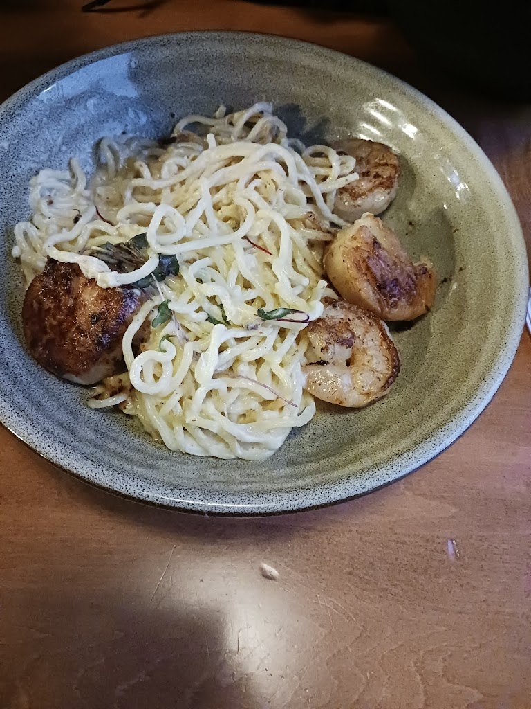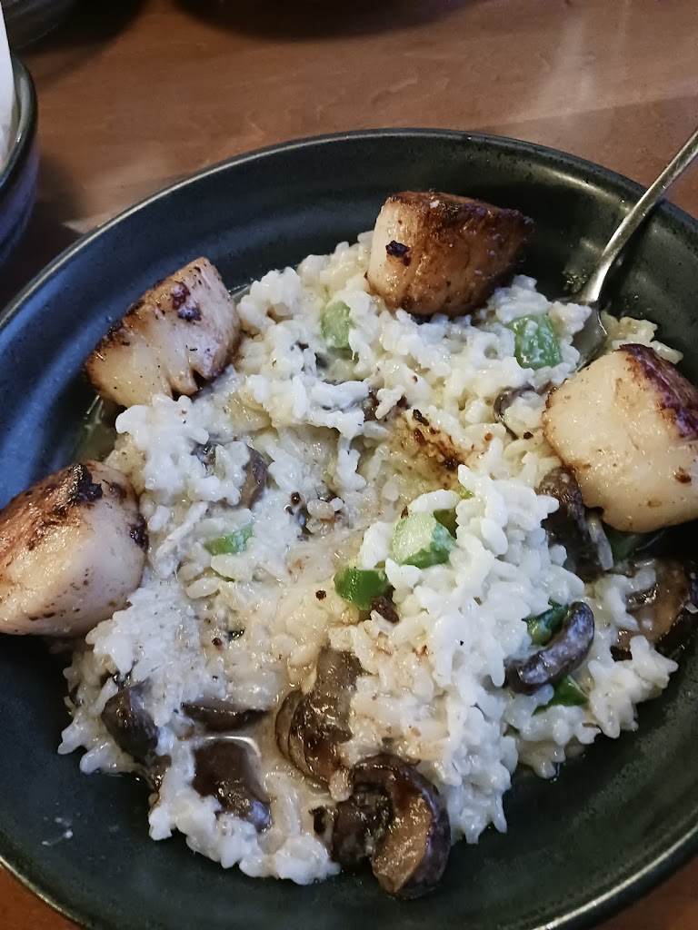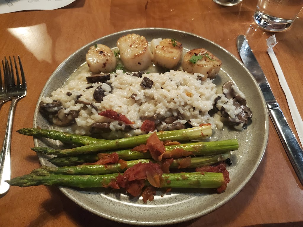 Ordered the seafood platter with what was called a salmon steak, swordfish steak and scallops. Comes with mushroom risotto. Unfortunately they weren't steaks, but more like 3 bites of each fish. Risotto was crunchy and lacked flavor. Then dove into my scallop and found it to be undercooked. Very overpriced for the amount of food served. The only saving grace was our wonderful server. Will not be going back for the free Friday e-coli special.