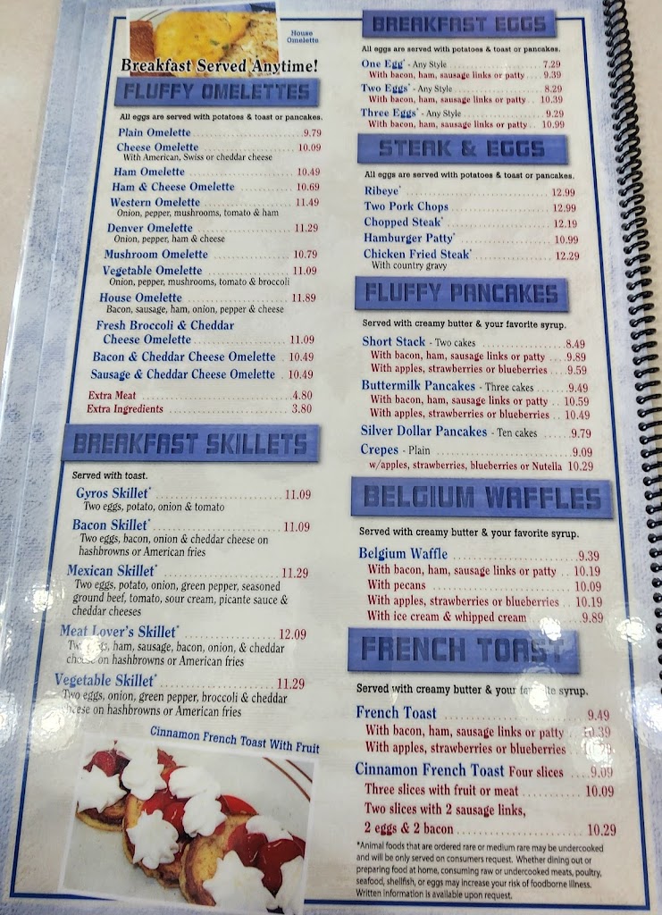 Enjoyed their anytime breakfast on my evening visit. The Denver omelet was very fluffy, filled with generous amounts of diced ham, green peppers and chopped onions. It was paired with perfectly prepared American fries and pancakes instead of toast. A very good meal for about 14 bucks, including tip.