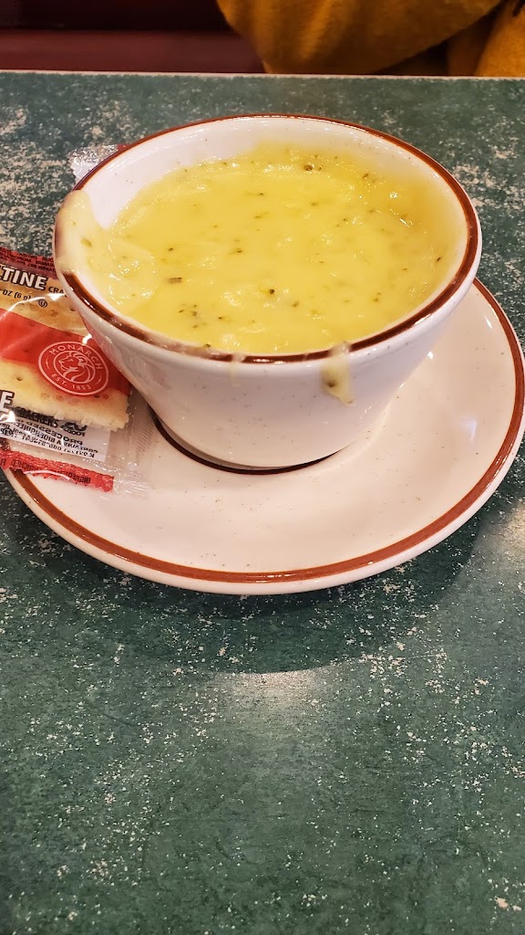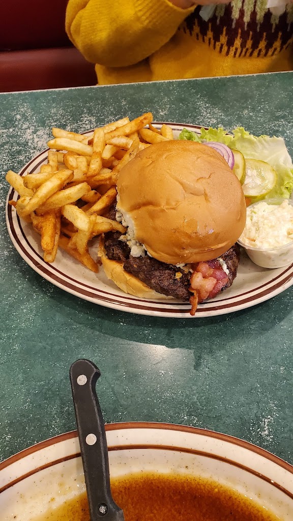 We had two soups—cheesy broccoli and minestrone—both were great. For the main course, I got a ribeye steak with mushrooms and mashed potatoes. It was okay, nothing special. My girlfriend had a burger with blue cheese and bacon, and that one was really good. It came with a side of potatoes, which were also great.