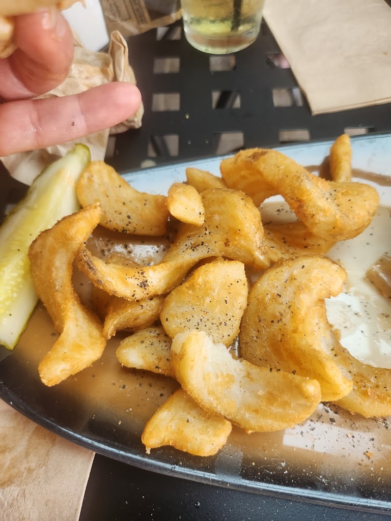 We dined in and were waited on in a reasonably amount of time. I ordered a tap beer and everyone else got soft drinks. The bartender forgot about my beer. After we got our appetizers the waitress recognized I didn’t have my drink and went to see what was going on. It took another several minutes to have the bartender bring it over to the table. Then we waited a while to be asked if we were ready to order. Which we were before the appetizers even came out. Once we got the food it was good. My wife got coleslaw and loved it. She’s picky about slaw so that’s a big plus. I got the Carolina burger which was good but the brisket on it was over done and tough. Tasted good though. The fries were fantastic and the curled steak fries are a notable novelty I enjoyed. Overall the food was good but not great. The place was clean and had a very nice atmosphere. After getting our check the waitress apologized for the delays we had. The staff were very kind and friendly. I would say they could use more experience. Initially I was unhappy but over time I chilled out about things. We had a good time.