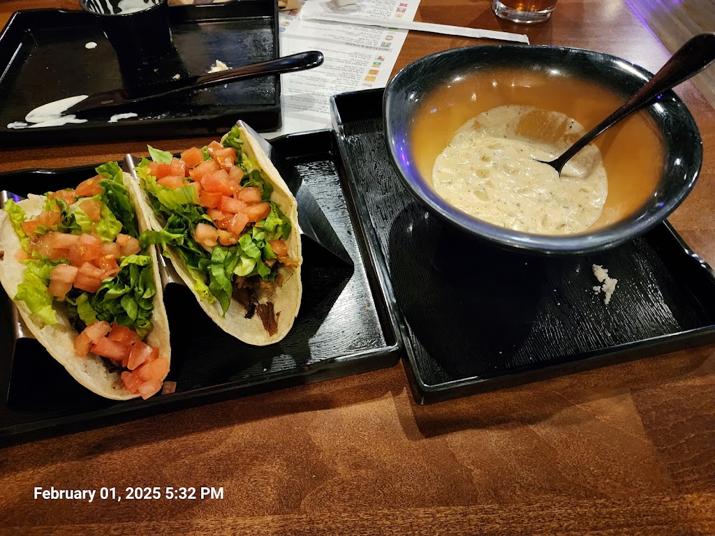 The Two20 Taphouse - offers for appetizers 4 delicious jalapeño poppers wrapped with - we think, phillo dough - deep fried filled with brisket & cream cheese served with a side of ranch dressing. The peppers are supple, the brisket tender & cream cheese cools it all down. Then I tried the delicious special Garlic Baked Potato soup it is chunky, hearty & perfectly spiced. I had the brisket tacos for my main course, I had asked for added romaine lettuce & tomatoes, but somehow no pickled onions or slaw was on it - so it was very dry. I used the remaining ranch dressing to moisten the tacos. My spouse had a bourbon burger w TapHouse fries. He enjoyed his meal thoroughly. Mom had a mushroom burger without bun & sweet potato fries. She was dabbing the burger on a napkin to eliminate some of the excess grease, but she loved her fries.