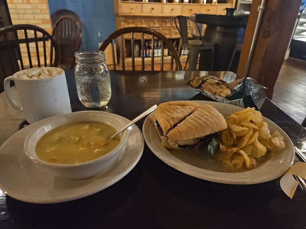 Chicken dunpling soup and Chicken Avocado sandwich with chips. Also a Marshmellow mocha with oat milk. Cozy fun place to relax by yourself or with a friend