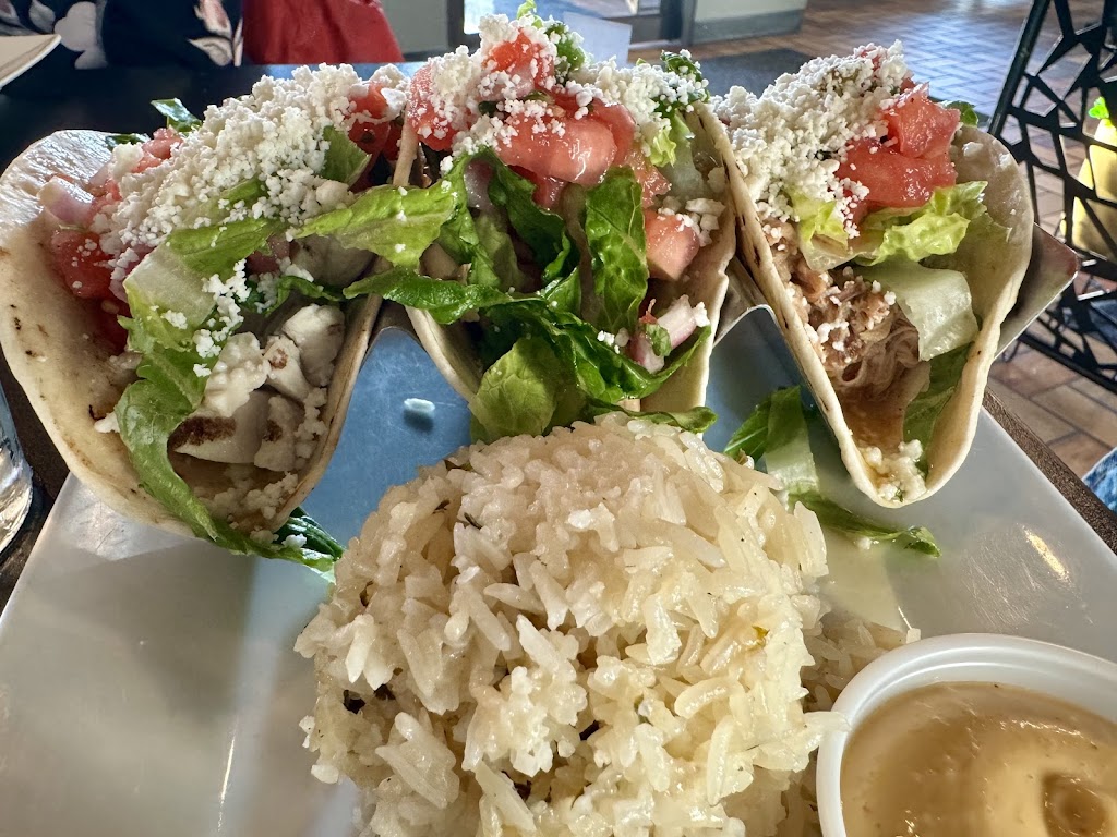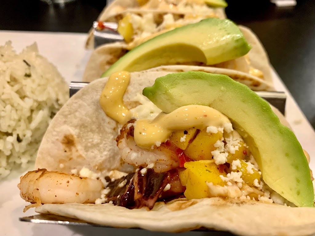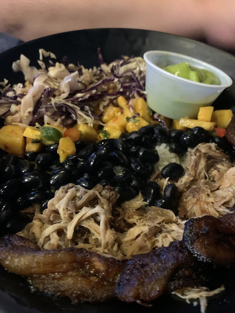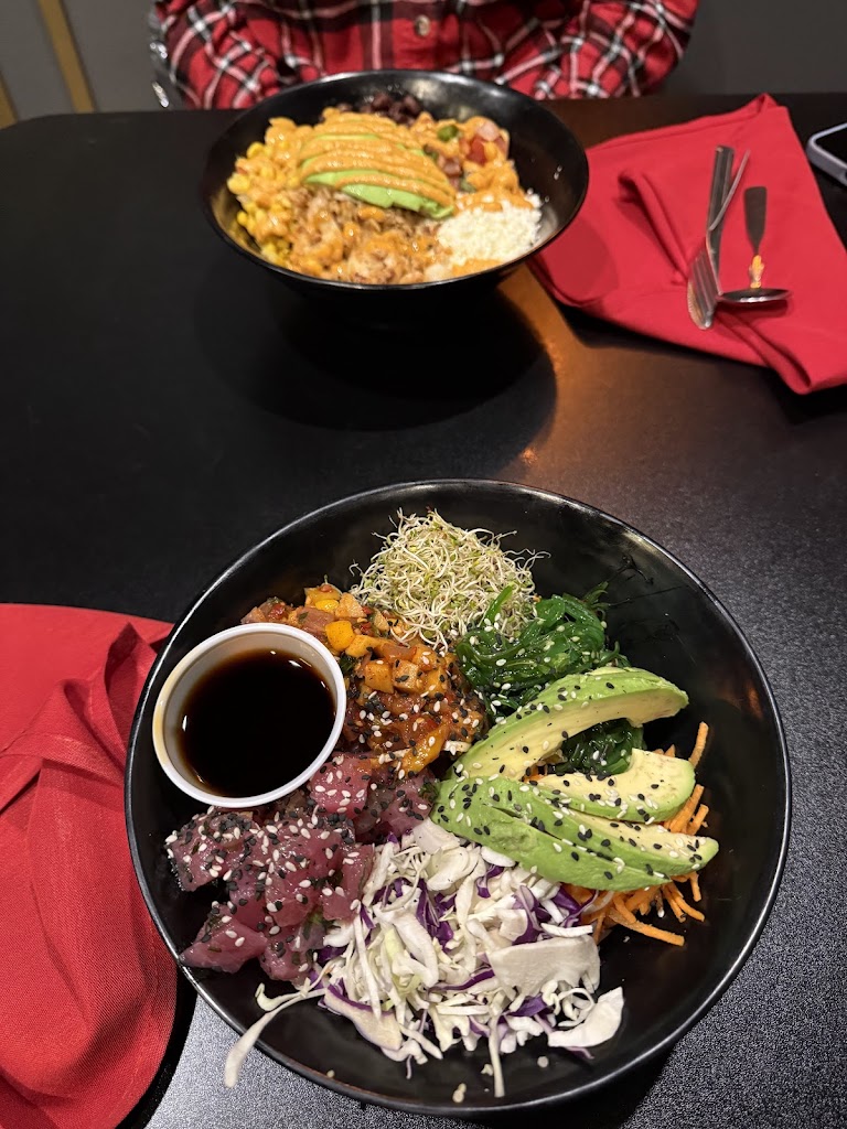 Tinga Tacos for appetizer, Dominican Bowl and Hawaiian Poke Bowl.