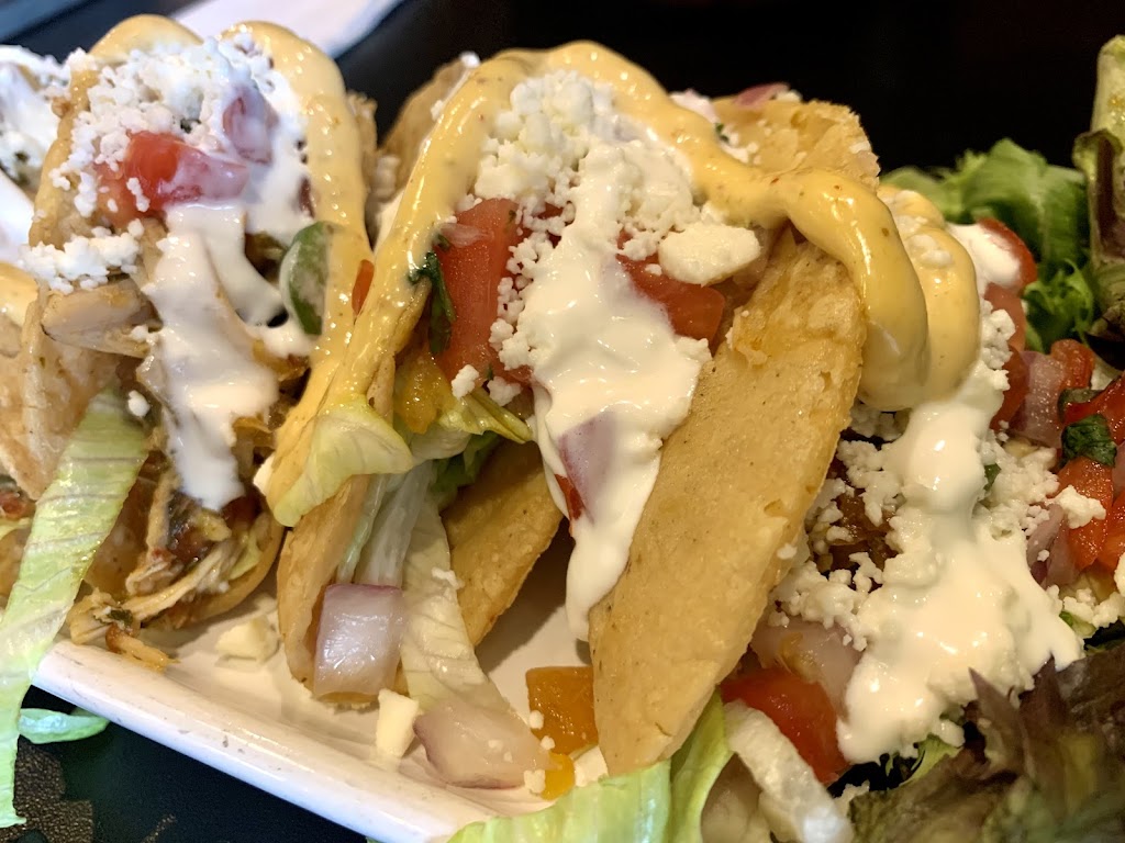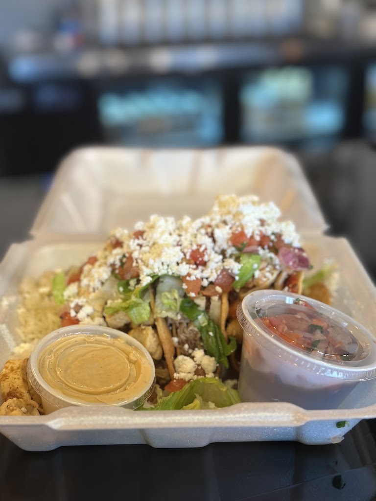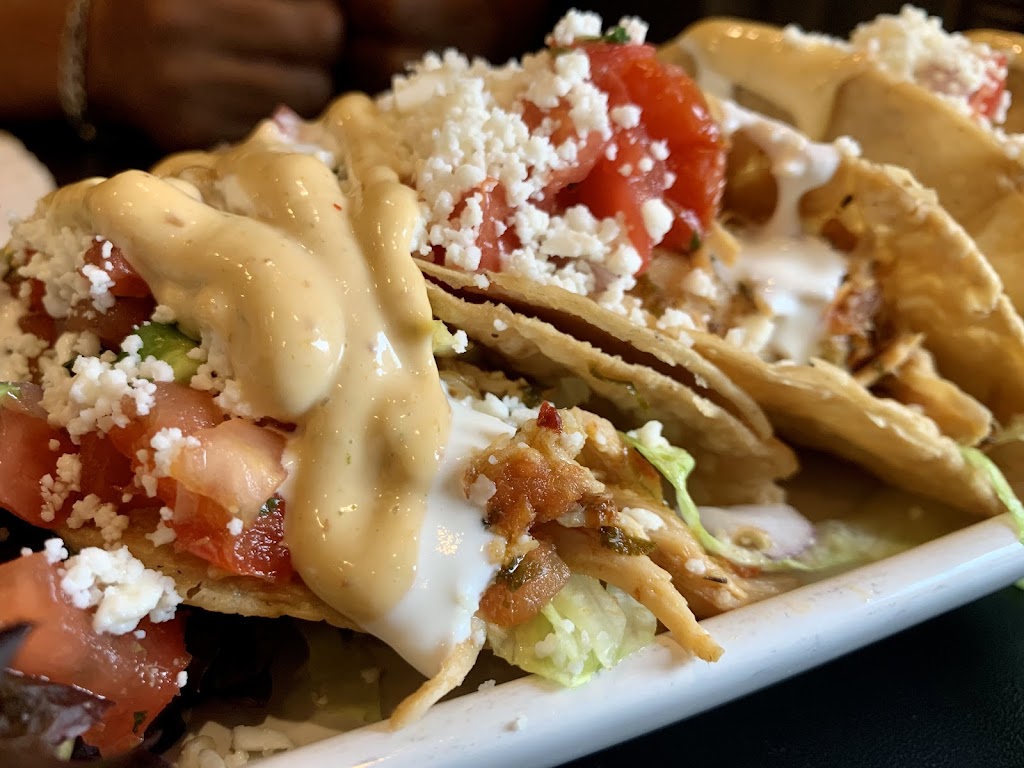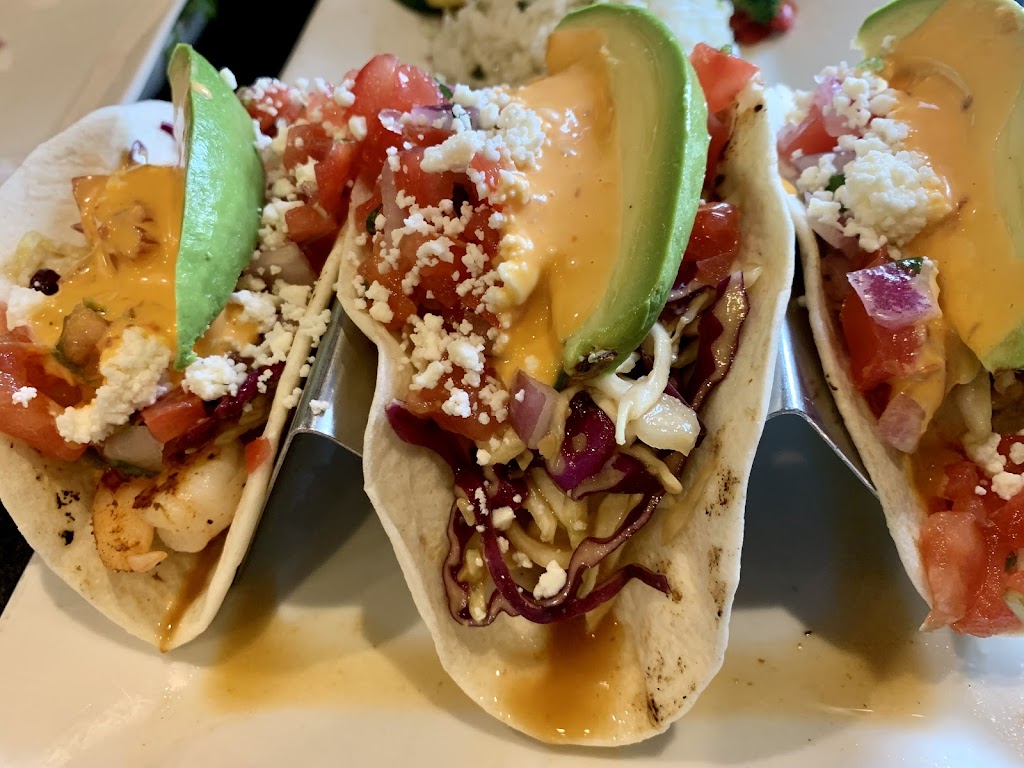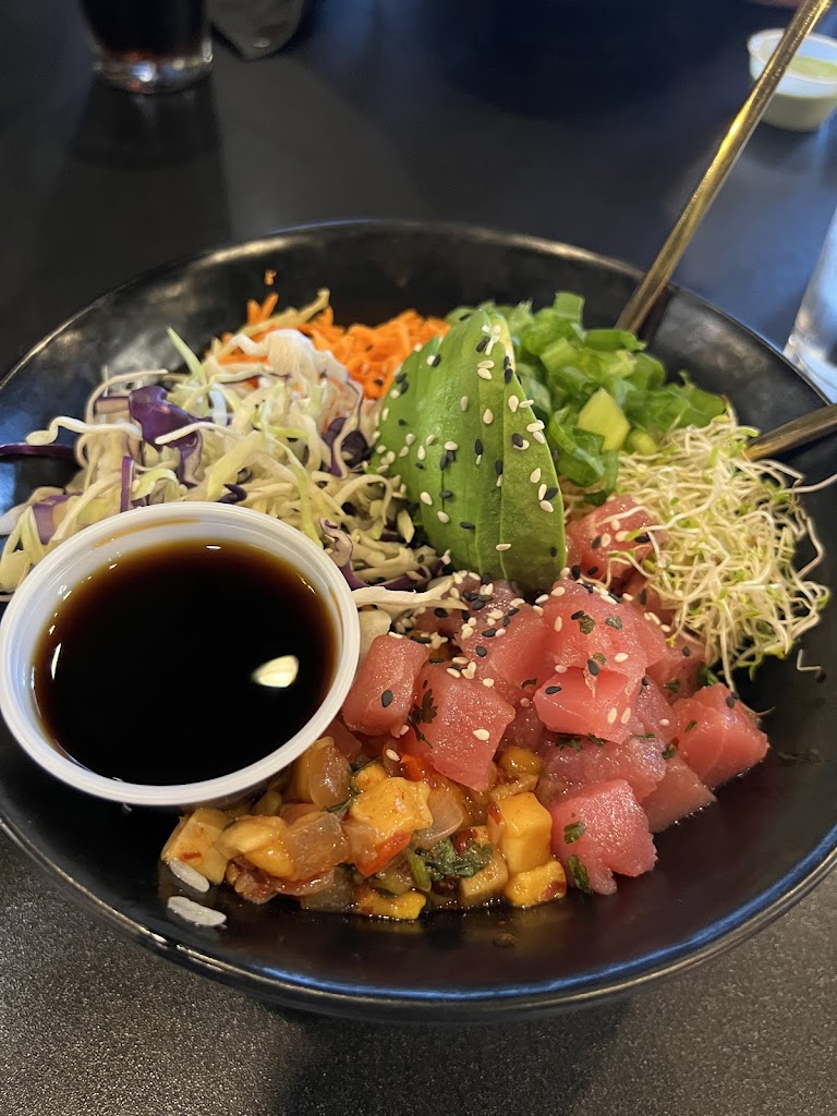 Tinga Tacos for appetizer, Dominican Bowl and Hawaiian Poke Bowl.