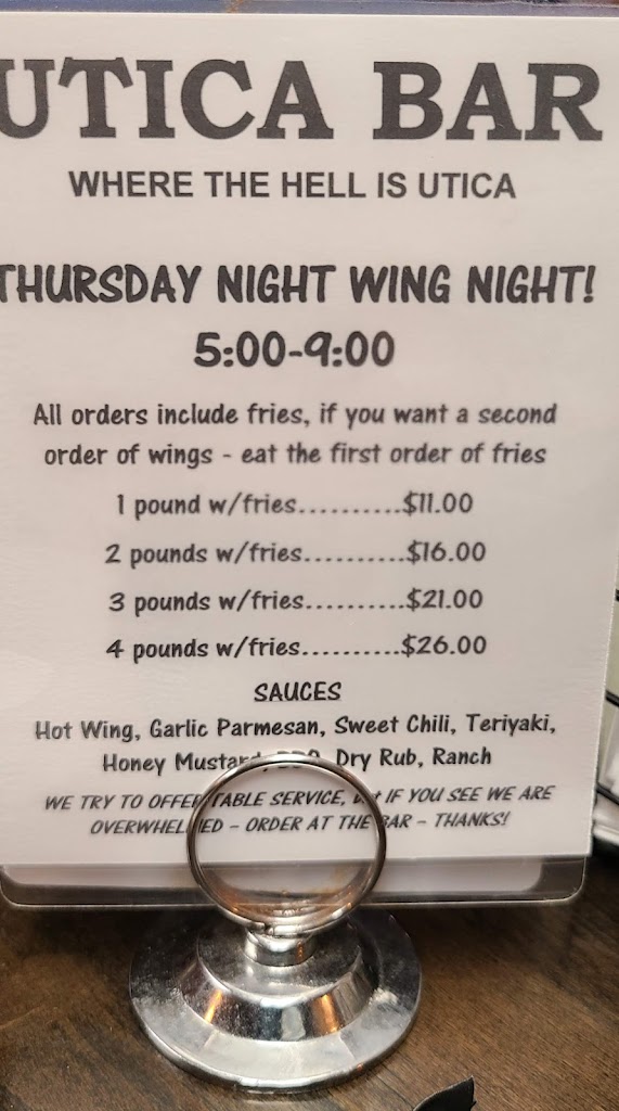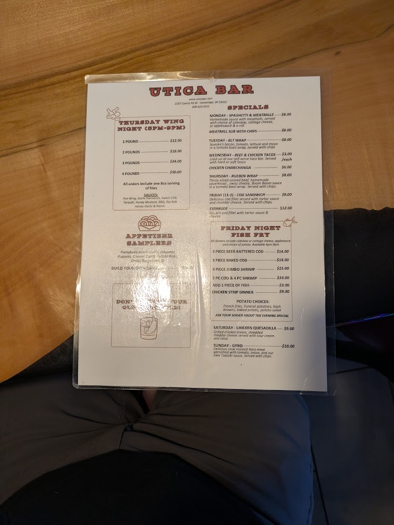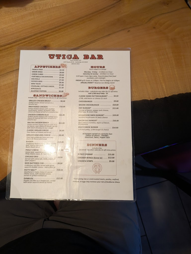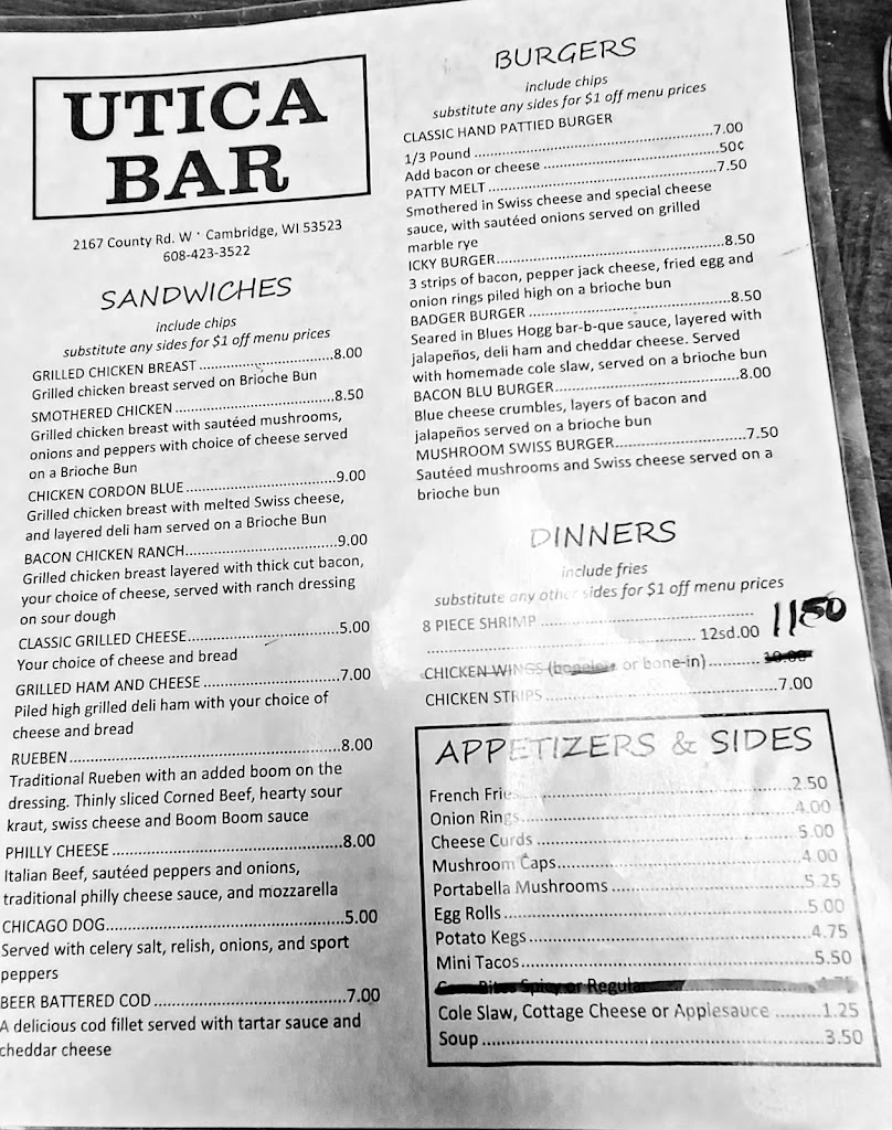 Really cool fun bar recommend by a local from Milton. Utica bar is literally in the middle of an intersection of corn fields. Sign on table says " where in the hell is Utica " Food is really good, menu prices are really good too. Lots of bikers com here, really friendly people.