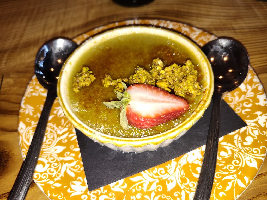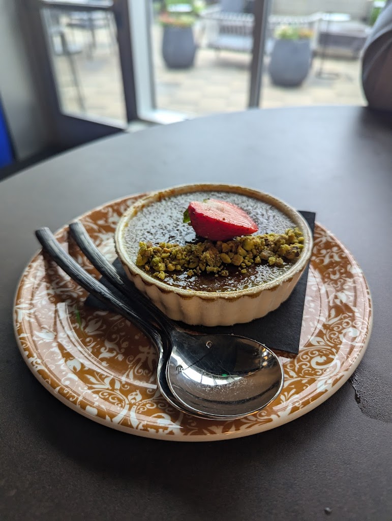 Desserts need a bit of improvement. The chocolate cake was over powered by the almond drizzle around it. The chai creme brulee was too "thick", a bit too sweet, and had more hints of holiday spice than chai.