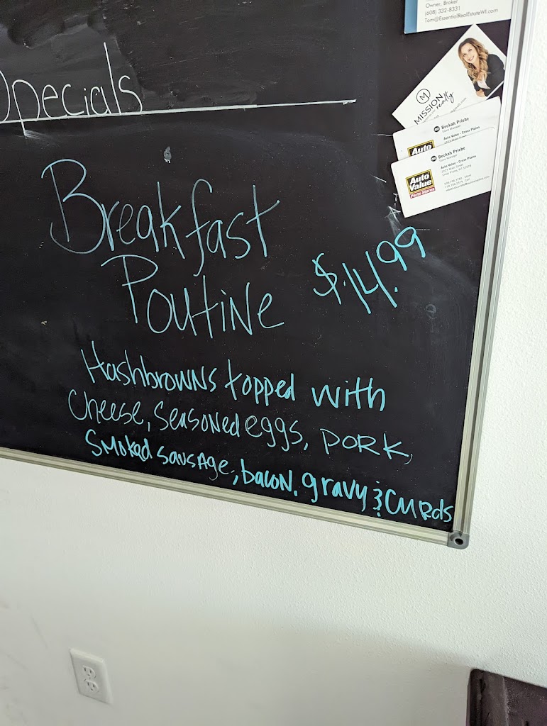 My son and I had been camping at Eagle Cave, and stopped here on the way home for breakfast. It was so nice. The breakfast poutine was delicious and the service was great.