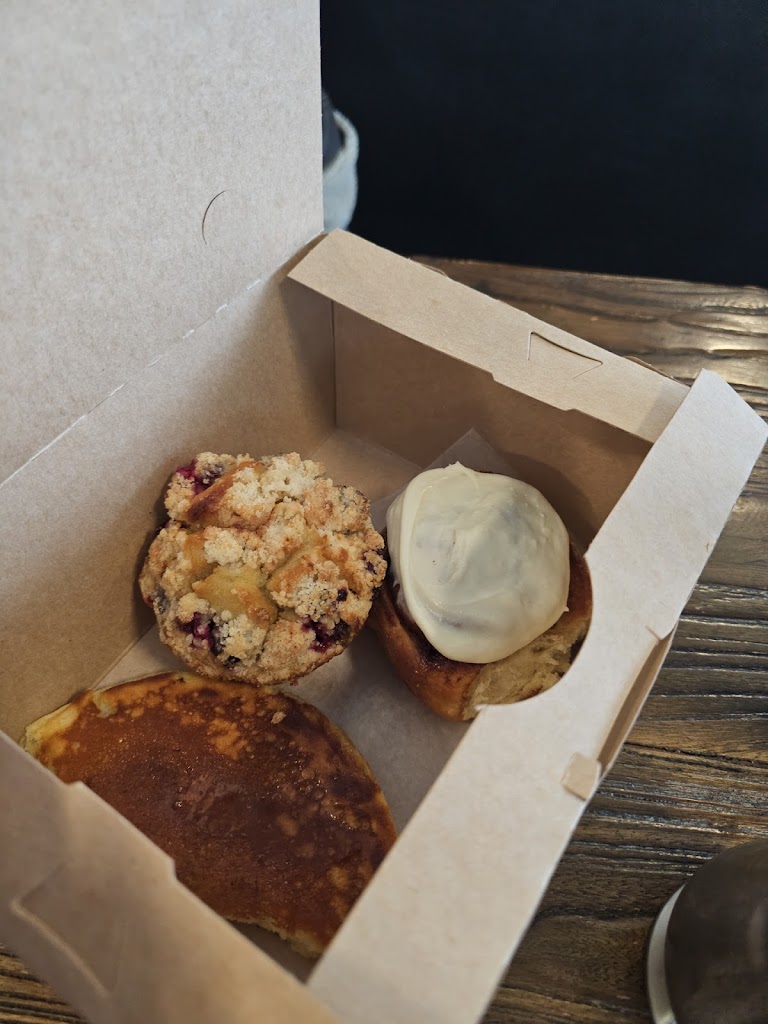 Great location, prices and staff! Had the breakfast special of hazelnut pancakes with fried eggs and 2 strips of bacon as well as chocolate chip pancakes cooked to perfection! The pancakes are the best I’ve ever had- super fluffy and BIG! Grabbed some cinnamon rolls, a scotcharoo and a s’mores cookie for later. The cinnamon rolls are out of this world good! Great job guys. Any time I’m thinking n town I’ll be sure to stop by. Thank you!
