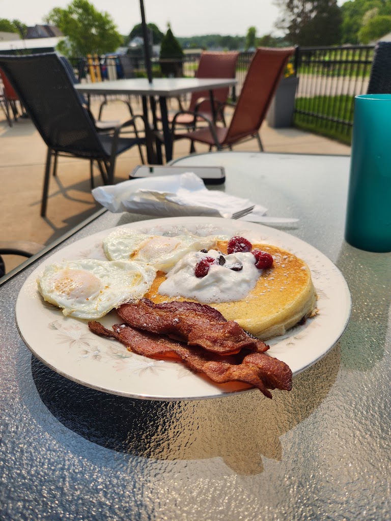Excellent food, service and amazing seating on their back patio. We got the Elvira breakfest sandwich and the raspberry pancake special. Both were amazing. Will be back.