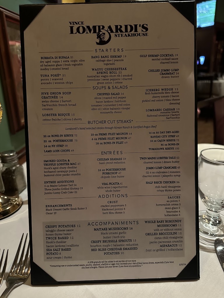 The food and especially the service (ask for Debbie) at Lombardi's is second to none! Get a wedge salad (classic) or a great steak, it's all top shelf! Great place and great food and especially great service.