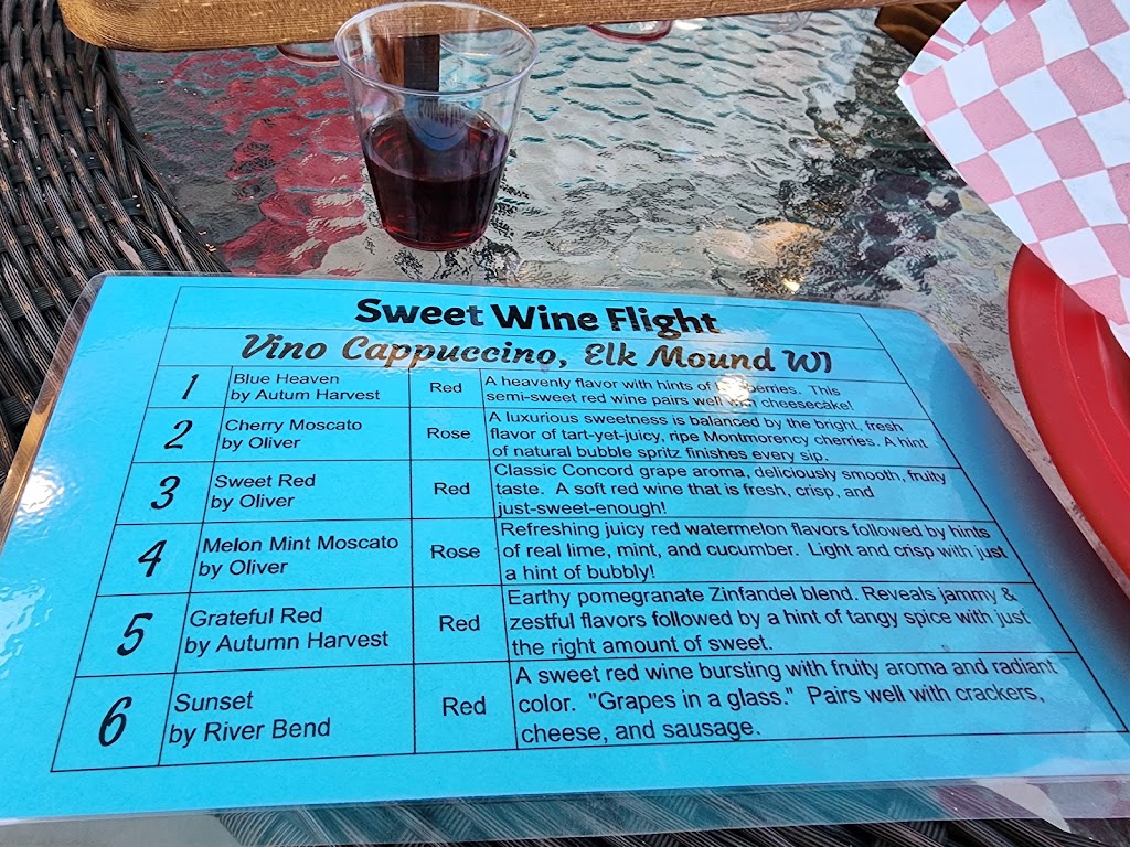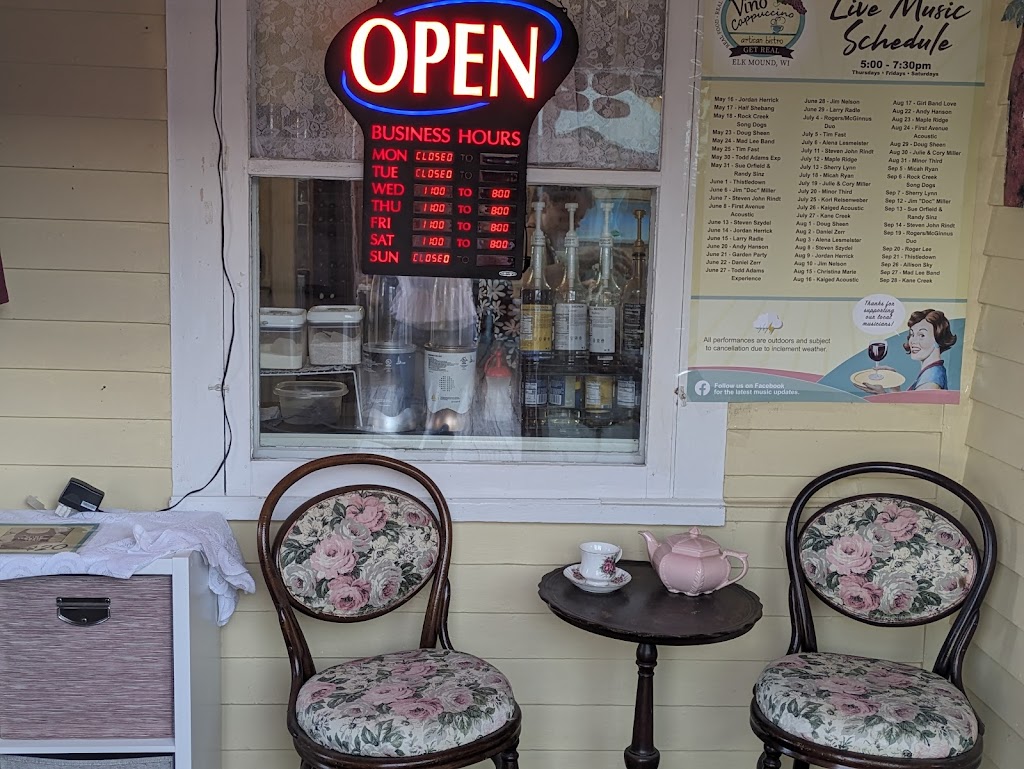 Wow. Is this a hidden gem in Elk Mound or WHAT! As soon as you drive up to Vino Cappuccino, you are meet with the beauty of the building itself but also the serenity of being off the beaten path. Once you walk into the bistro, you'll probably be greeted by Elvis, the owners' sweet little dog! You're also instantly hit with the incredibly enticing smells of their wood-fired pizza. I went for a late lunch, so I got the Maple siracha panini with a side salad. Everything is so fresh and delicious! But then you go across the picturesque patio and enter the coffee/dessert bar. And when I say the smell of coffee is intoxicating, I mean the aroma of freshly ground coffee wraps you up like a warm blanket in the winter. Holy crap is it enticing! I went with an iced honey latte and I'm really wishing I'd gotten the bigger size! All the staff are so friendly and helpful, and the owners especially give it such a personal touch! This business is for sale and if I could afford it, I would be honored to carry on the legacy they've started here. I really, really hope whoever buys it keeps the fabulous vibes going!! Thank you for the lovliest of afternoons!!