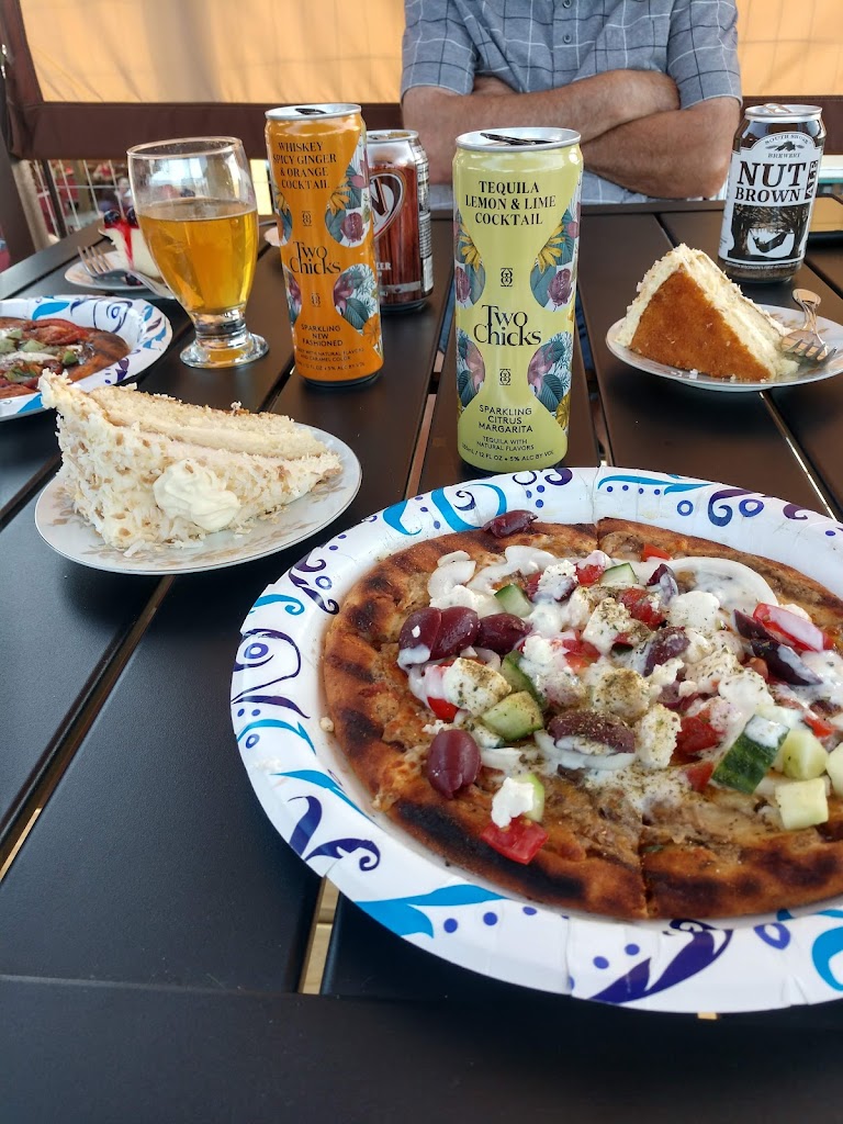 Really cool open farmhouse concept with excellent food. Also live music, beer and local wine selection. We tried gyro pizza and bison bacon maple sriracha panini with French onion soup. Desserts were caramel apple cupcake and tiramisu - everything was delicious and grabbed a few apples off the tree to go. There is a wine tasting area, mini library and art gallery inside the farmhouse. We also said hi to the kitten, puppy and chickens that were around enjoying everyone’s company. Overall a very laid back and charming vibe.