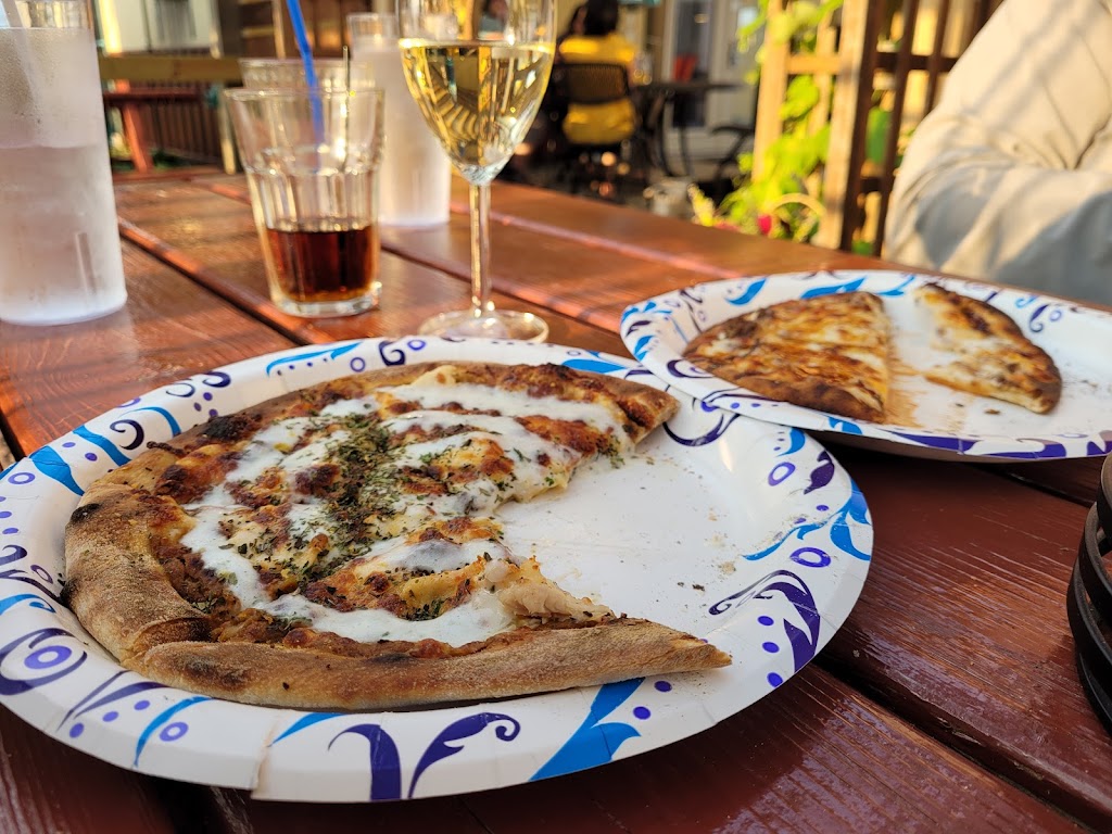 The chicken pesto pizza was delicious and the perfect size to share so that we could get dessert and coffee. Friendly service and a fun atmosphere!