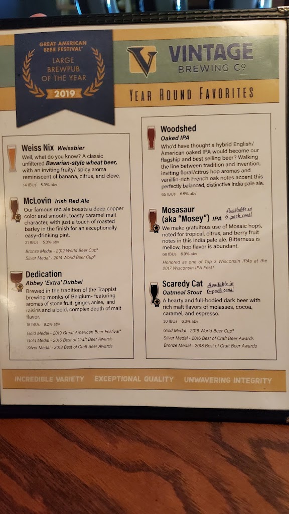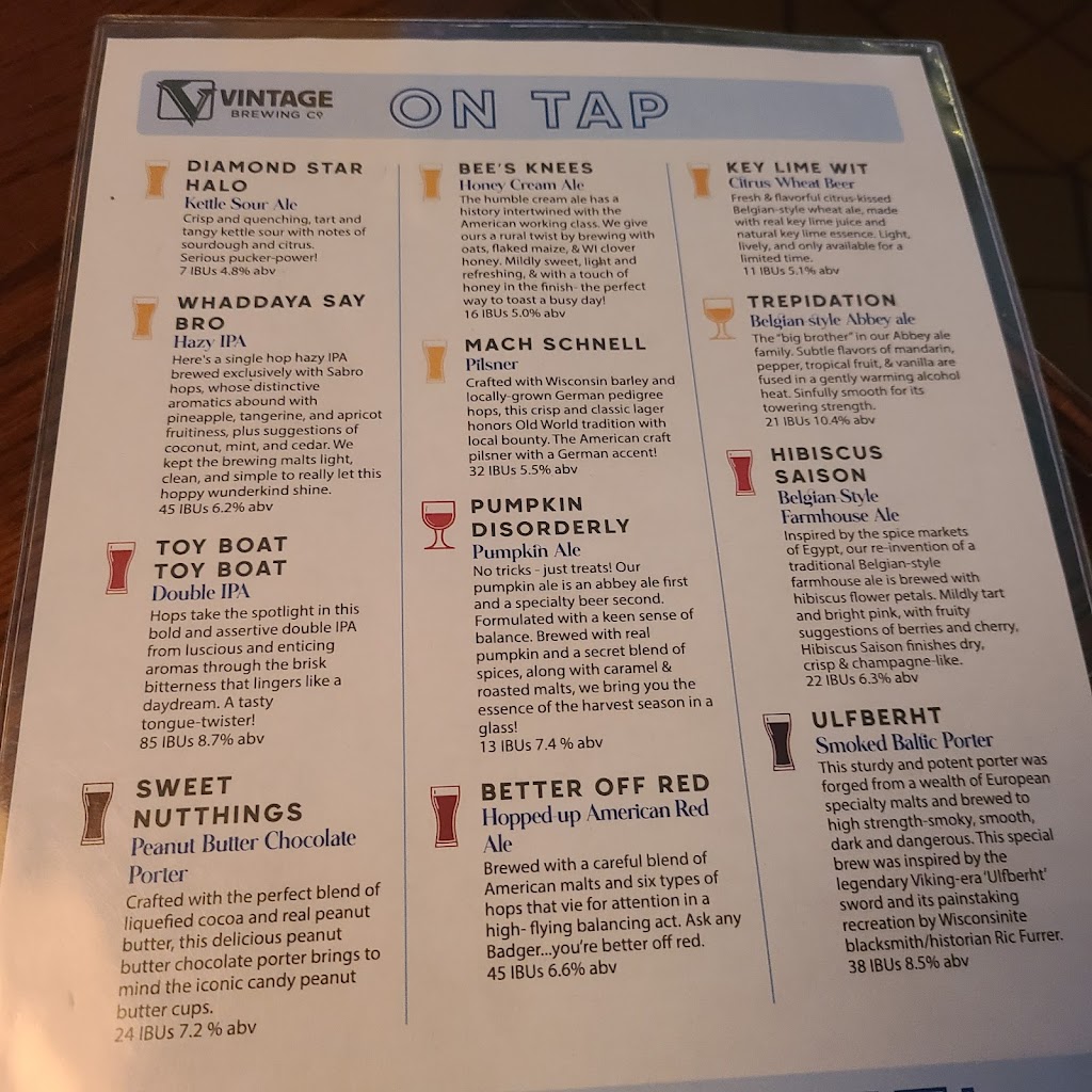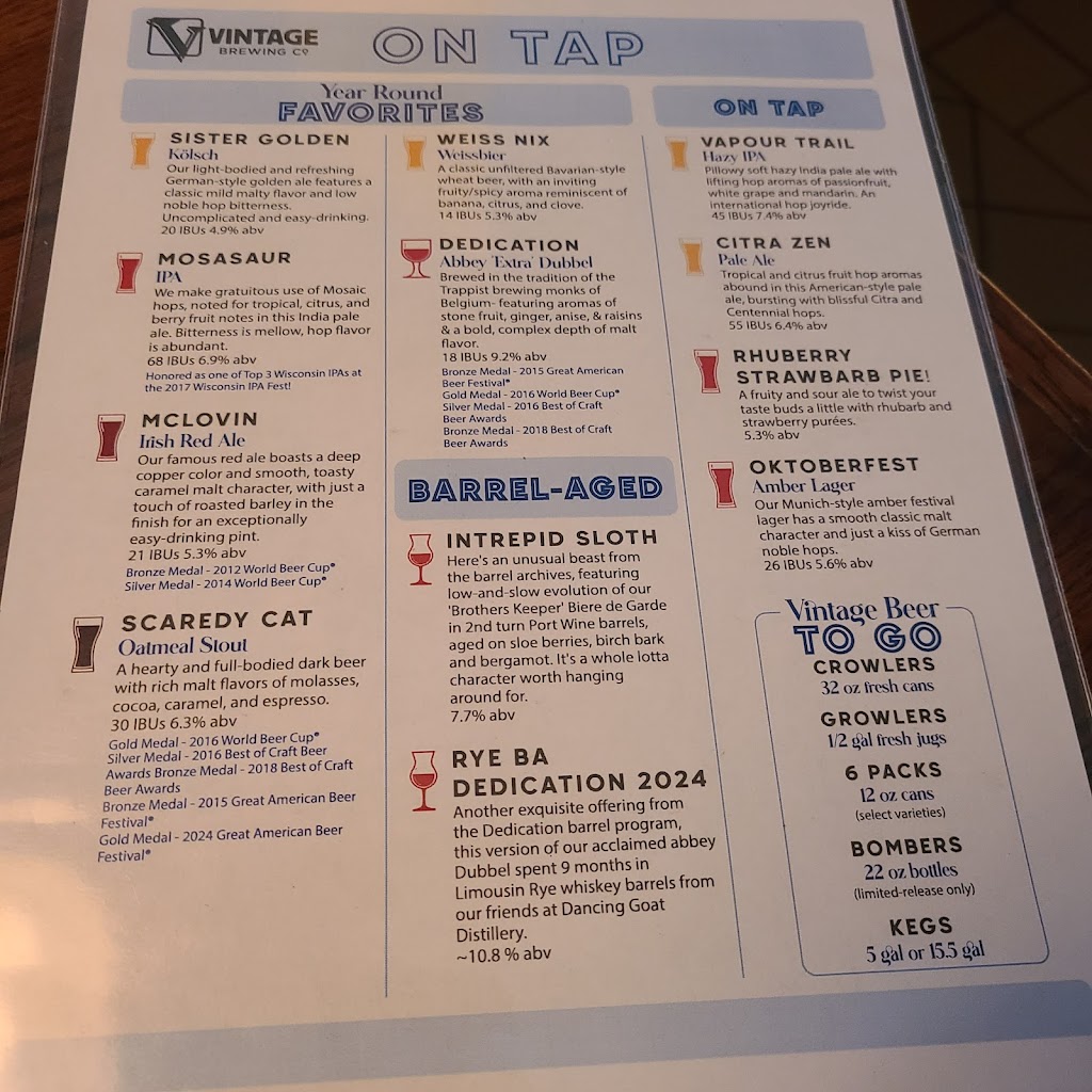 Vintage is on Pub Pass! Good beer. Tried the Razzmary this week! Never had anything like that before! We usually sit at the bar where service is pretty good. We had a weird experience the first time we went, though (a couple years ago) — they refused to seat us because we weren’t planning on a full meal.