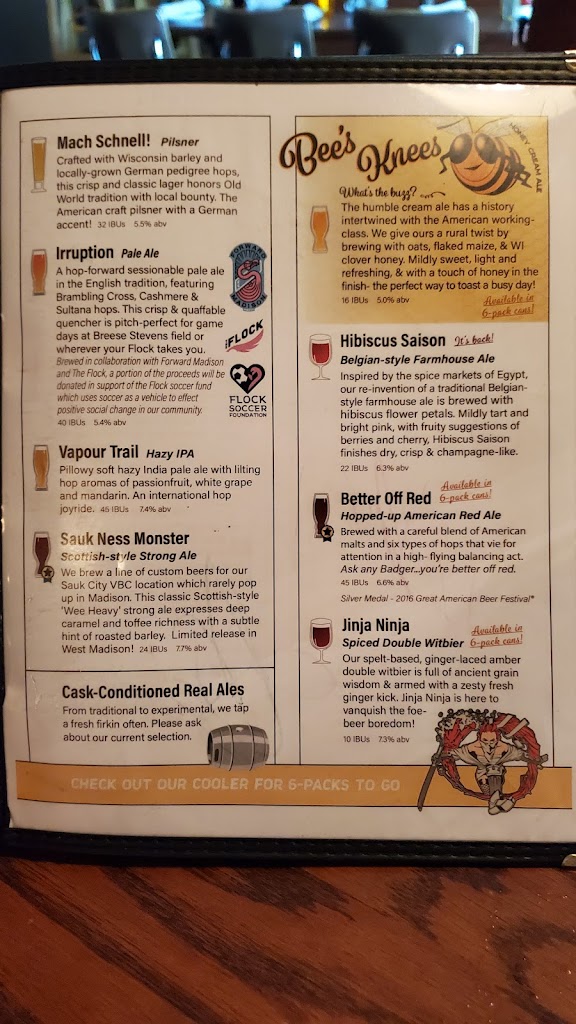 Wide variety of award-winning craft brews (20+ taps)! Delicious Americana-style food with many made-from scratch items to dine on in-house or available for take-out. House-made craft sodas and kids food menu are great for the wee ones. Bar open until close with after hours food options. Event space great for parties or meetings with customization dining options. Catering available to go or for pick up in the Madison area.