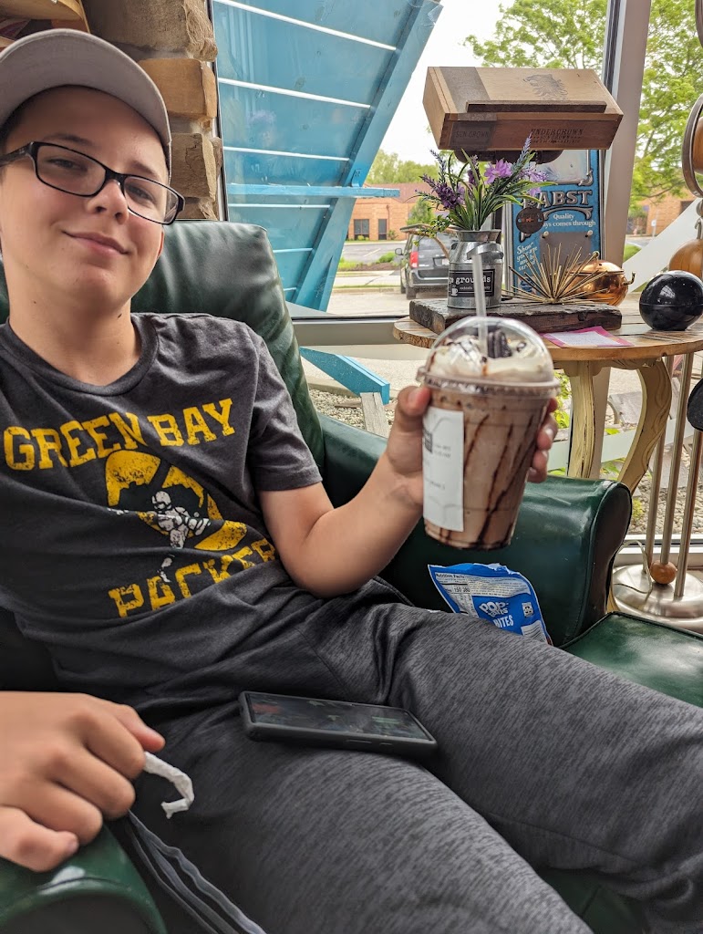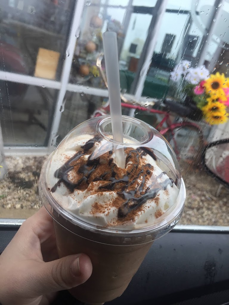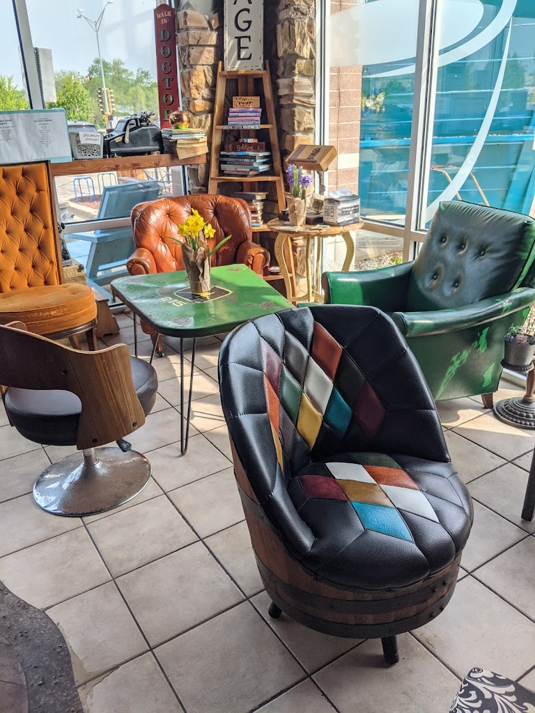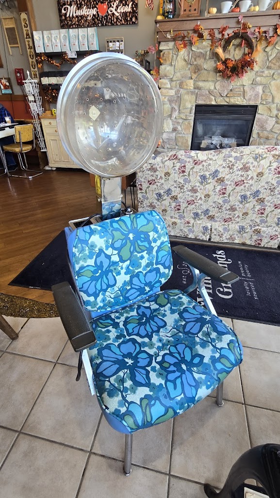 Nummy yummy pumpkin pie frappe with espresso! Cutest little shop in Muskego. A must stop location. It definitely has vintage vibe from the barrel chairs to the hair salon seats. So much to see and eat!