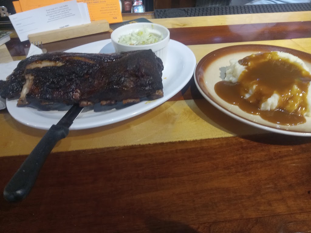 Had the rib special with mashed potatoes and coleslaw. The ribs were a little dry but still tender and I thought they could use a little sauce to compliment the flavors but that's my opinion. Overall it was good