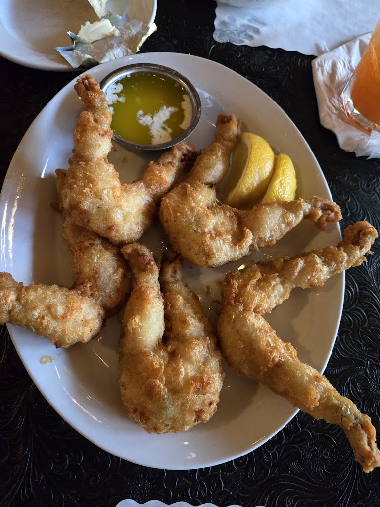 Beautiful atmosphere! Great service from DeAnne. Frog legs were amazing. Salad bar with lots of toppings and has hot bacon dressing amongst others Prime Rib was just ok . Bland and a bit tough . We will be back