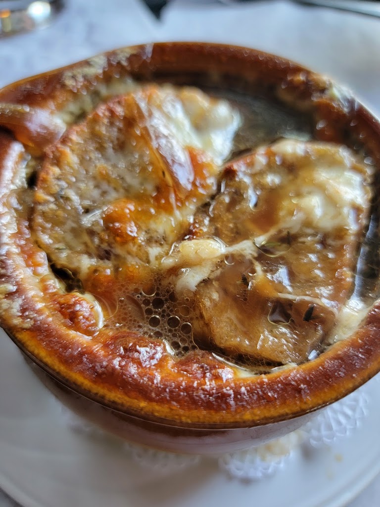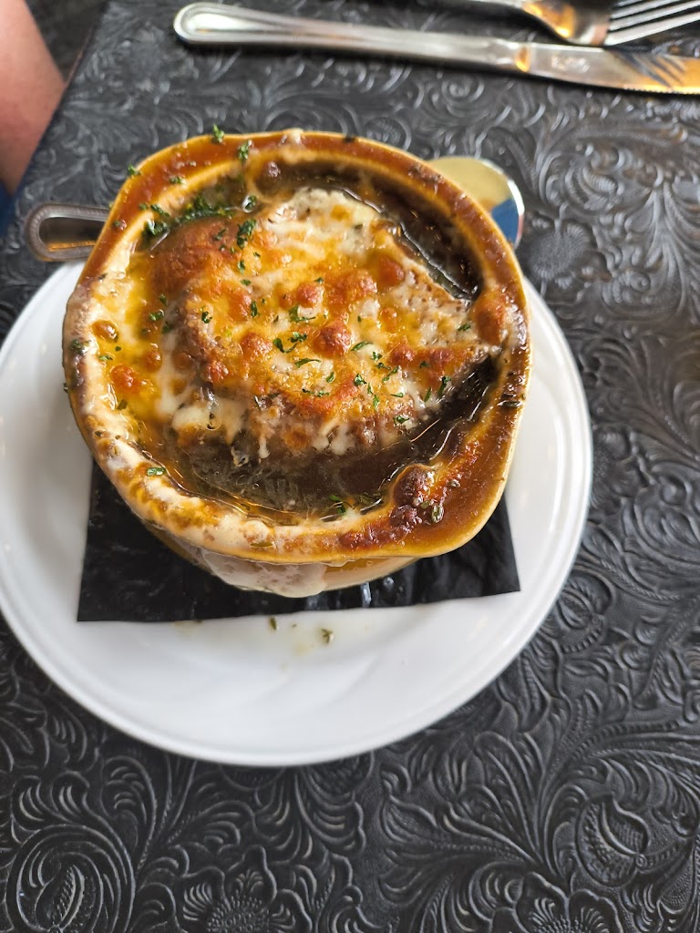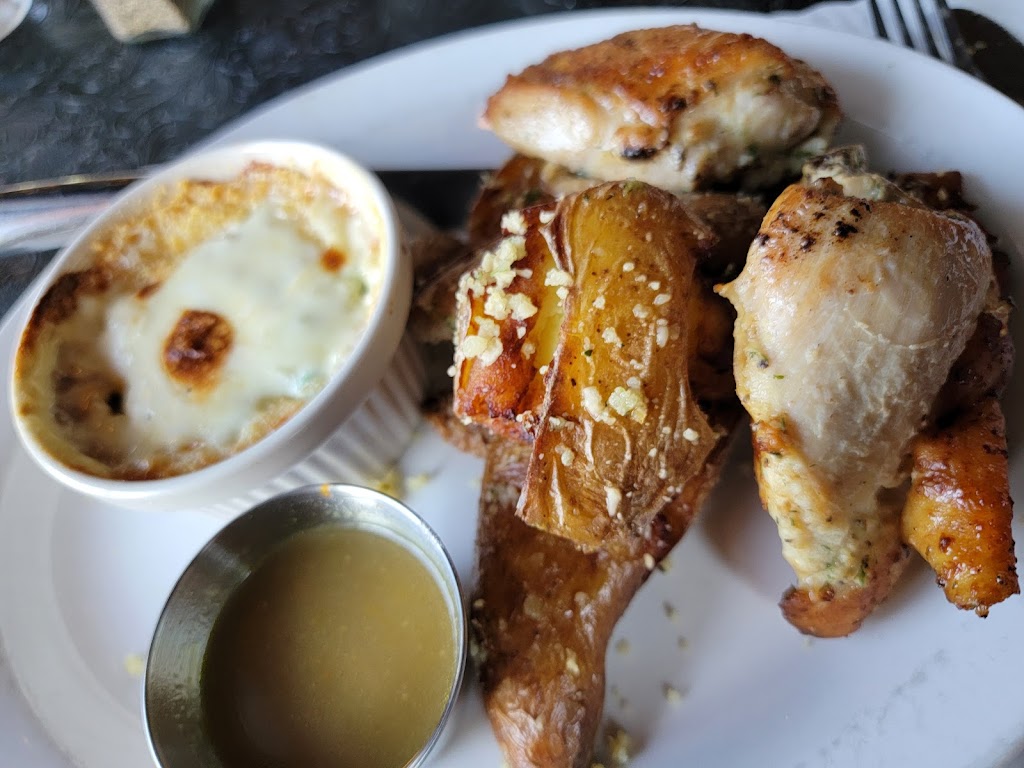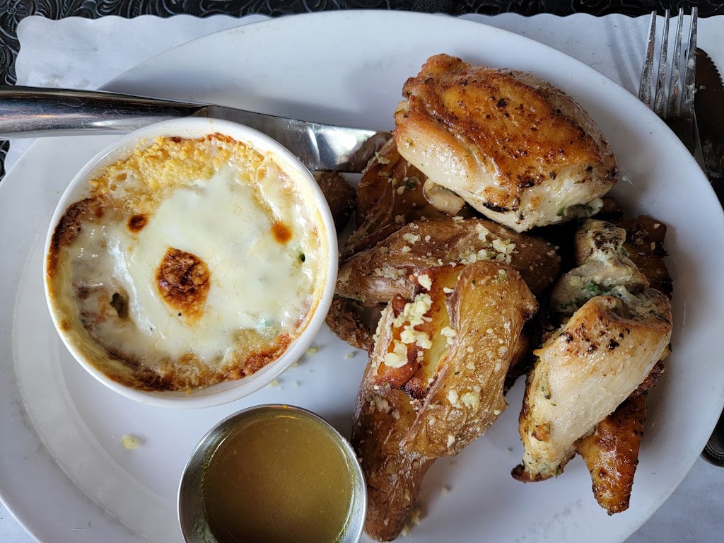 -French onion soup, chicken piccata, loaded baked potato, and fries were fine, but not spectacular