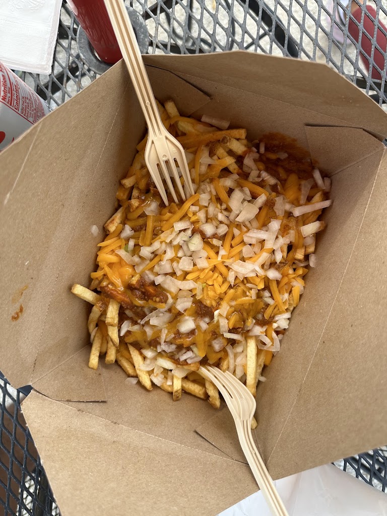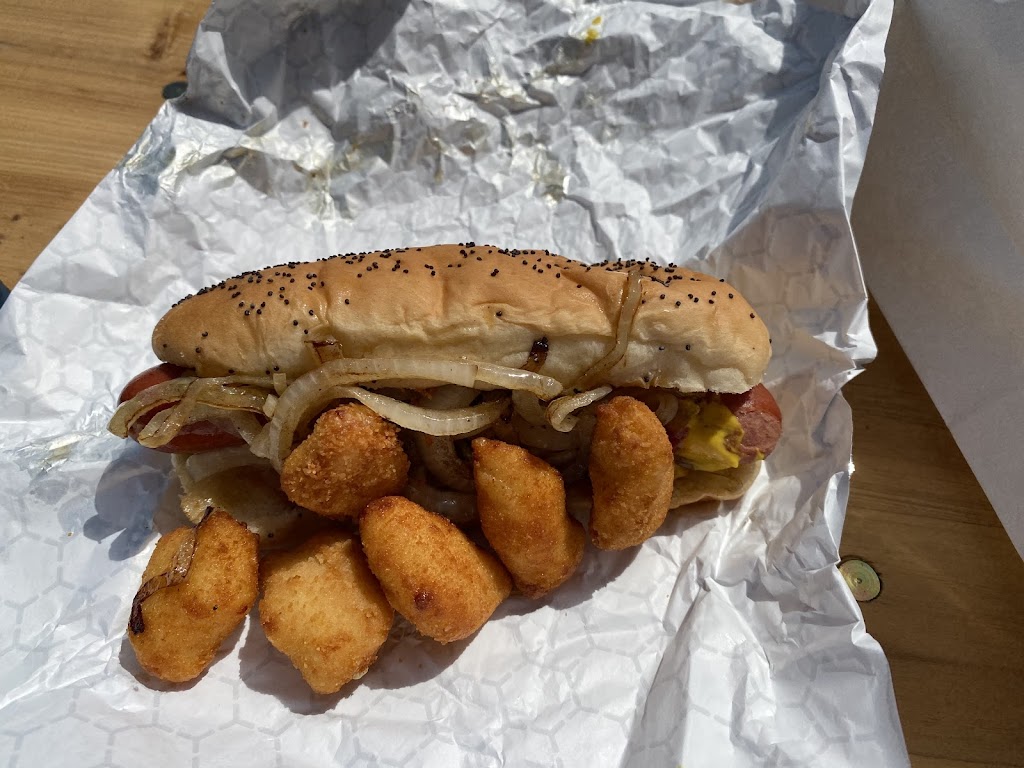 Wisconsin dog had grilled onions and fresh fried cheese curds. Great fries. Hit the spot after a long morning bike ride.
