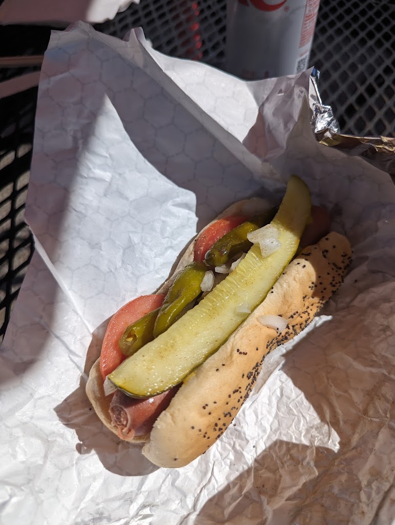 Perfect Chicago dog in the shade by the lake, great breeze, friendly service. Fantastic menu options for vegetarians as well.