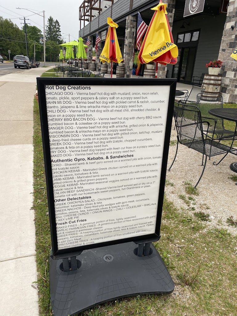 Much more affordable than most places in Door County, beautiful setting, very friendly service! They offer much more than just hot dogs, we really enjoy the gyros and kabobs. The serving of french fries is huge, I would suggest sharing it with at least one other person if not more, they are very tasty. We will miss them when they pack up at the end of the season, they are a great addition to the downtown Baileys Harbor area!