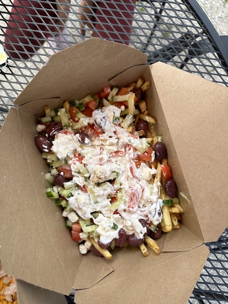 Great service, tasty food. We (2 ppl) ordered Greek fries (fries with Greek salad veggies topped with feta and yogurt), cheese curds ( never a miss) and a salad. We shared, weren’t able to finish the meal due to the portion sizes, left satisfied and will be coming back! Also, the place is PET FRIENDLY!