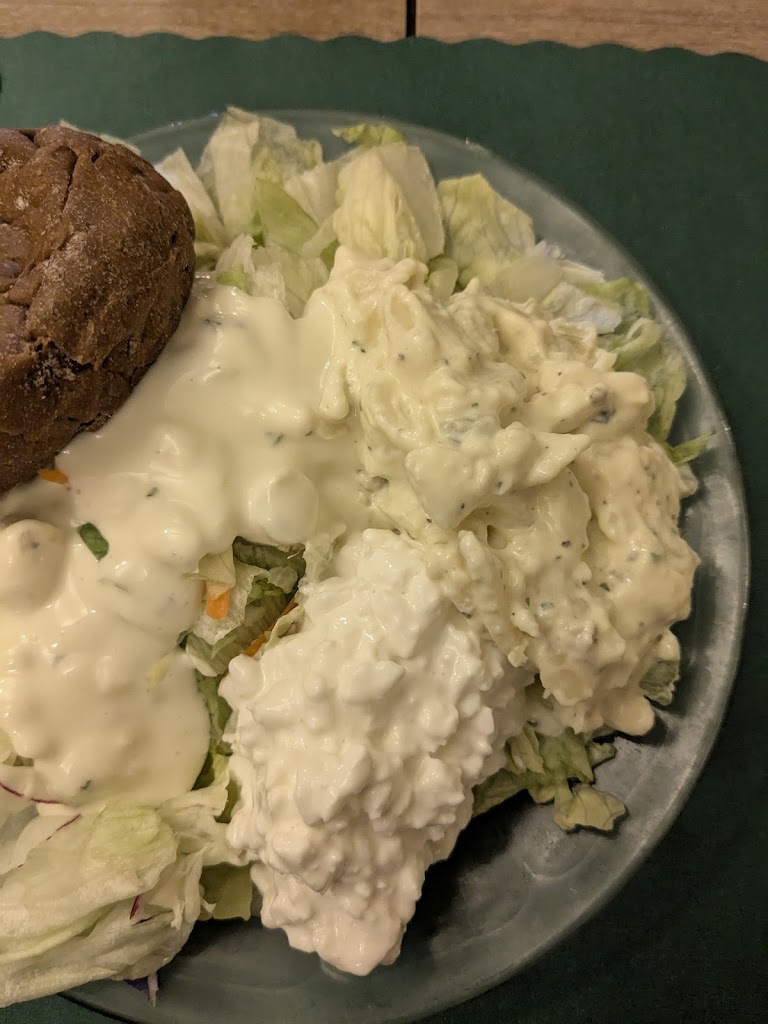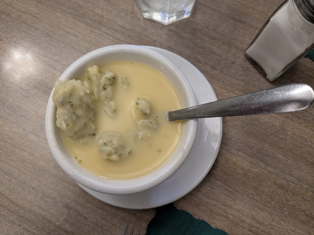 It's a good value for the money, but not as good as it once was! The salad bar is a shadow of what it was the last time I went, and a bowl of lettuce with some carrots and thinly cut radishes was flanked with a huge bowl of diced tomatoes, a huge bowl of diced onions, and something else... maybe croutons... and three dressings-no 1,000 Island, but blue cheese, Russian or French, and one more. Alongside the salad was cottage cheese, potato salad, and coleslaw. The Polish Dumpling Soup was lukewarm and seemed watered down, but I don't recall trying it in the past, so I have no frame of reference. Finally the rolls were fine, but were cold and seemed like an older batch. The tips looked different, but no one complained. The fried shrimp and cod were hot and crispy, and the grilled cod was tasty. Saddest were the potato sides; the au gratin were a variation that didn't do justice, and the hash browns could have been so much better with some seasoning and a bit more of a cook. The servers are nice and efficient.