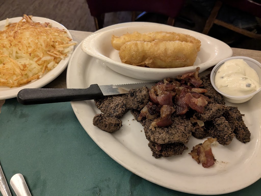 The food is mediocre at best. The interior needs updating, everything was old and musty. The service was good though the people were nice. The food was very bland. None of the food had much flavor at all, the tenderloin tips were very tender but the mushrooms and meat tasted like nothing. The batter fried shrimp and cheese curds tasted fine but they were way to greasy, like they were just soaking in oil for a long time. The au gratin potatoes tasted pretty good but undercooked. Overall it wasn't terrible it just could be much better