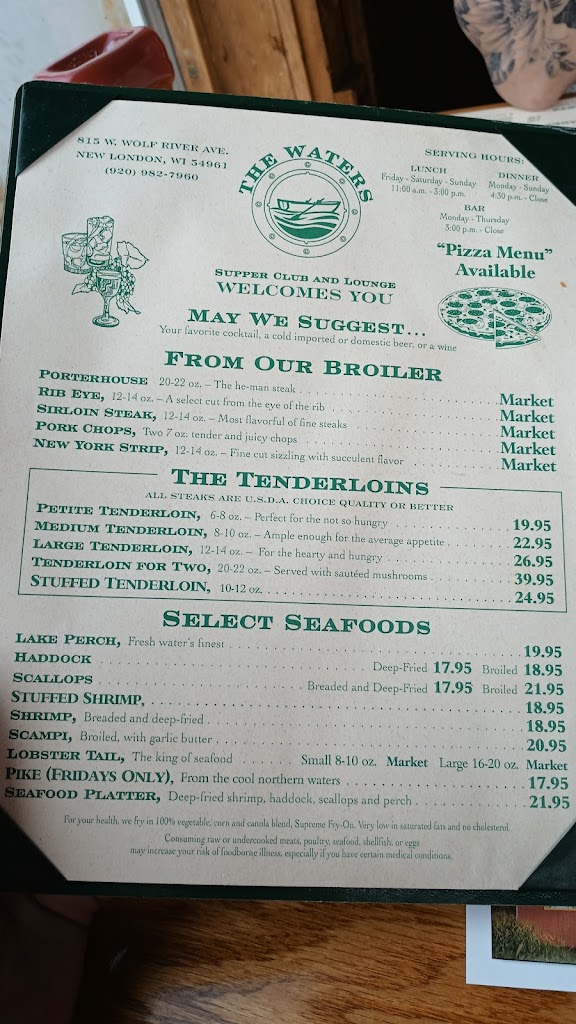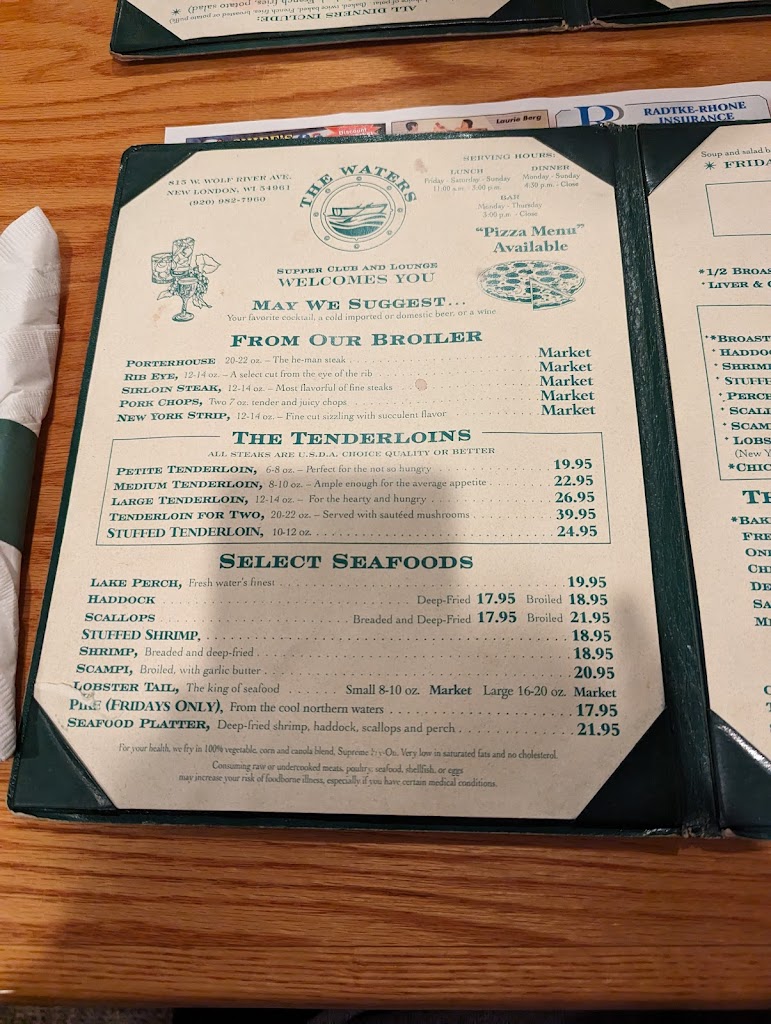 We’ve been here several times on our way to and from Northern Wisconsin and the food has always been excellent along with the service. The burger is homemade and excellent portions. My husband had the haddock it was light and delicious. The parking lot is always full great ambience and we enjoy eating here during our travels five stars and a big thumbs up to the Waters supper club team.