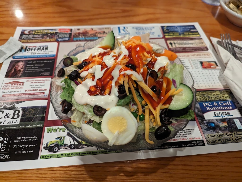 Great salad and soup bar. They even had hot bacon dressing for salad 🥗. The boasted chicken and ribs are very good. Great service. Took a little longer for food. But we didn't care we were visiting with friends. Nice outdoor sitting right next to Wolf River.