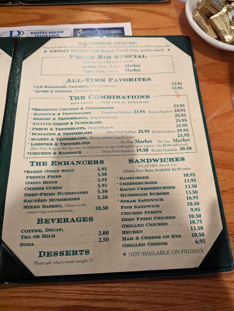 We came in for our wedding anniversary and had a good time at the bar waiting an hour and a half to be seated. When we were seated it was pleasant and the salad bar was average. Not a big selection but ok. When I got my order of prime rib it was tuff and bland. I ordered medium rare like I always do. When I mentioned it was subpar to the waitress she was sorry but never offered a comp on it. I left over 3/4 of a king cut. I might come back again to try again but will never order prime rib again! I will only order that at black otter or pine tree supper clubs. It was a big disappointment!!