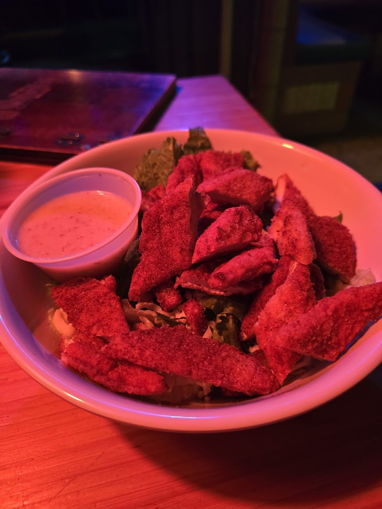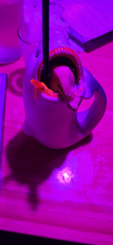The waitress was really nice and did a great job. The food would have gotten a one star, but the Cesar salad was good. The poke bowl is not what you think a poke bowl would be. It came on a tray with nothing more than tortilla chips and a sauce that was not good and the fish chunks. It was disappointing. The jerk chicken sandwich was bad, and the lightning inside not only gave us a headache, but also gave the food unappetizing colors. We didn’t have any drinks, so maybe this is a place to drink and not eat. My three stars are based on the average of the three categories of food, service, and atmosphere.