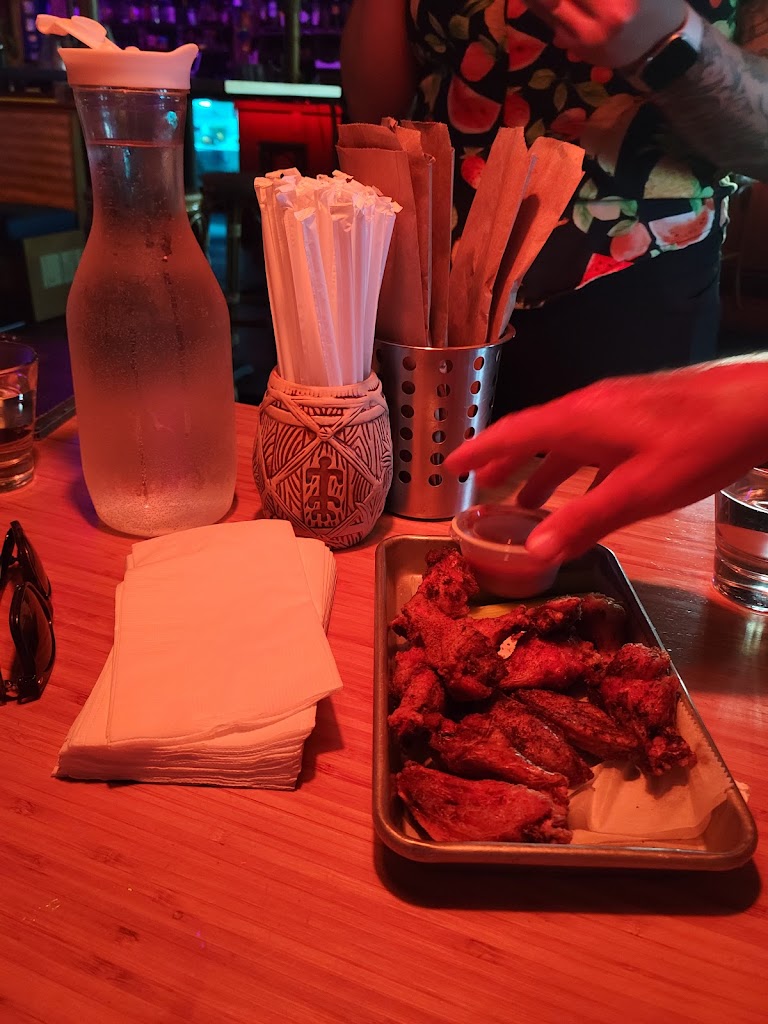 A fun tiki theme, nice atmosphere and great food. I had jerk wings and crachos which were nacho toppings on fries. Served with a fork, as there was a lot going on there! Just spicy enough, not overwhelming.