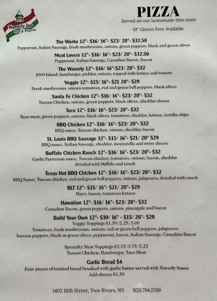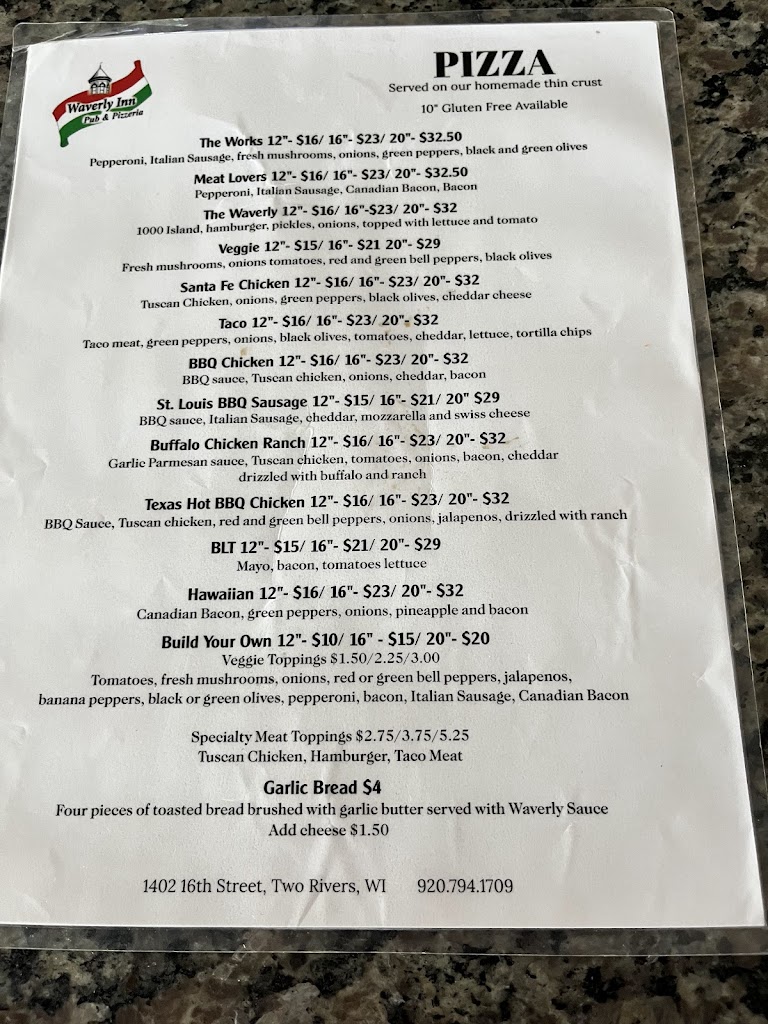 Tasty pizza and all sorts of other wonderful choices on the menu at Waverly in Two Rivers. We plan on getting there as often as possible. Positive experience with the employees, as well.