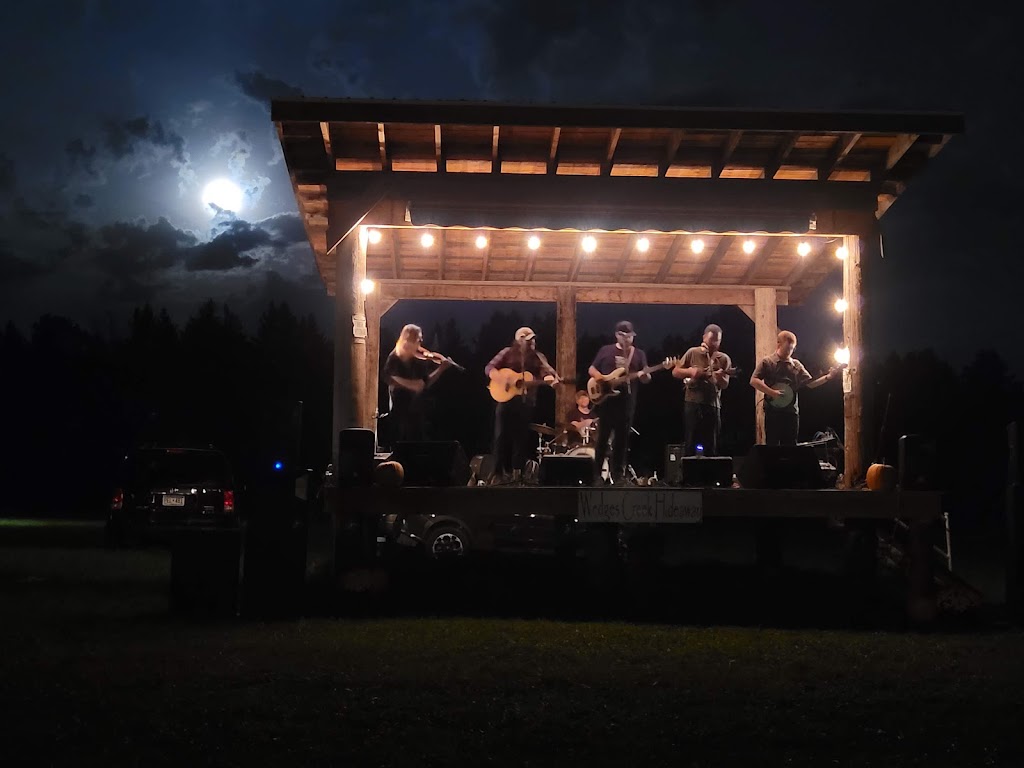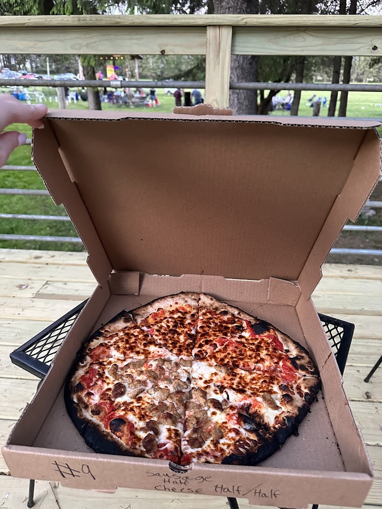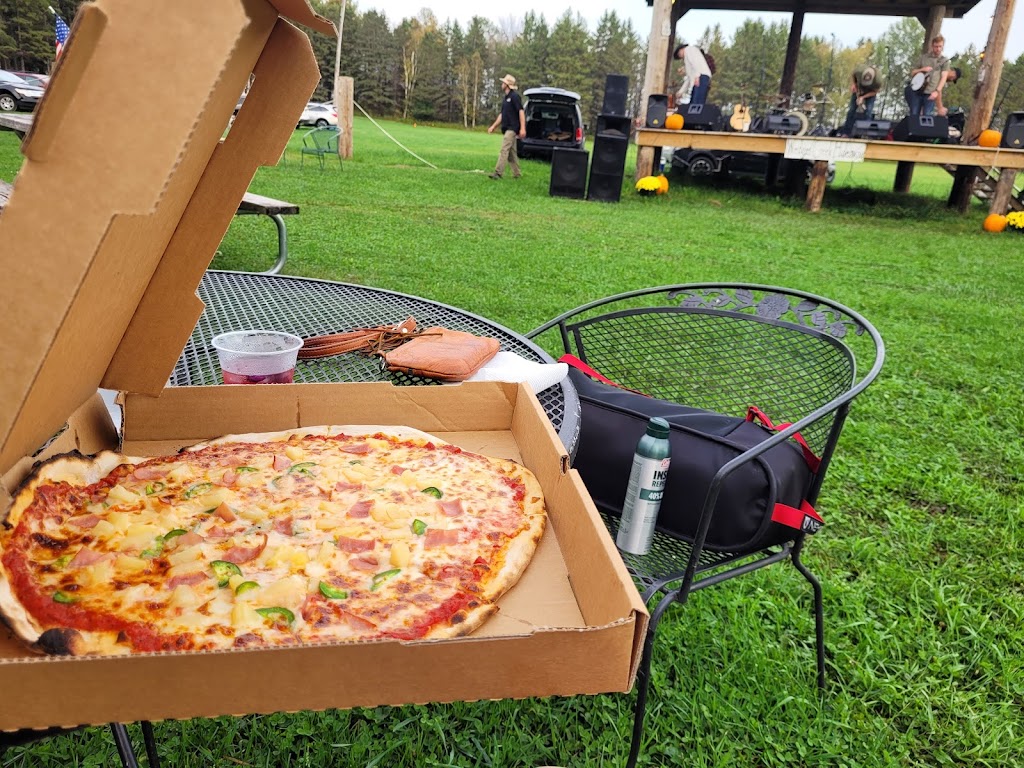 Awesome stone pizza! Wonderful country setting, live band, plenty of room, clean bathrooms, two bars and large fire pit! Also has camping! Visit their web site