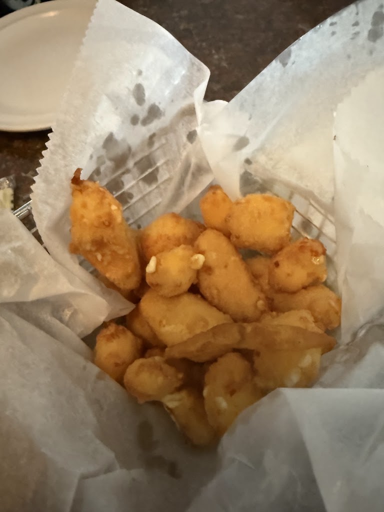 Place was packed for EAA Oshkosh week but the servers were very attentive & efficient. 30mins til we were seated inside. Eclectic place. Food was good. I enjoyed the grill salmon - wish they served it with rice and vegis though. Got baked potato and a roll instead. Dgt had chicken fingers and husband had huge haddock sandwich- this was so juicy and delicious. The clam chowder was ok; but cheesy soup was very creamy and delicious. The cheese curds were excellent!!