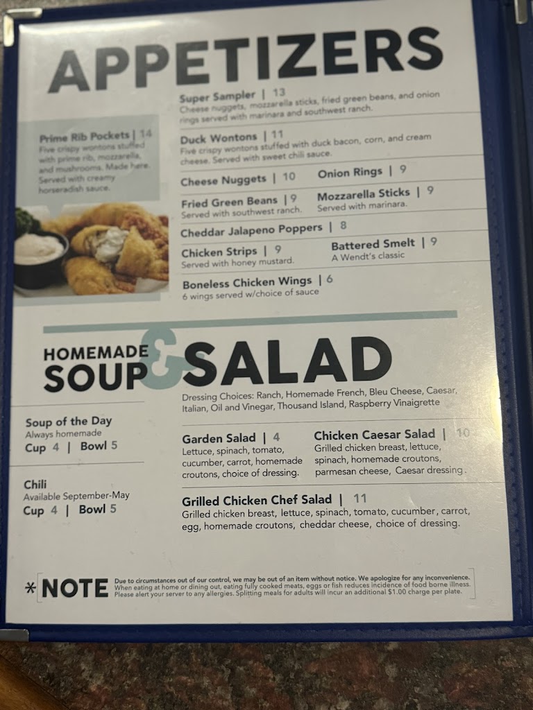 Family made reservations for birthday. We were given a limited 1 page menu. Most wanted Haddock and we were told no Haddock upon arrival but did have a baby Haddock sandwich. It was not busy at all. They did not know how to make my drink and asked me about it. The drink came and was not good, not mixed and ingredients were off. I took it to the bar and politely told them it did not taste right and was met with grief and some rudeness from an owner bartending. I just asked for a different drink from their menu which tasted ok when I got it. I felt very uncomfortable the rest of the time I was there as I sat with my family. We ordered. My sister could not get a baked potato, waitress said they were out of that too. I asked if I could get the cherry chicken sandwich ( not on 1 pg menu but regular chicken was on it. I was told no, sorry it’s not on the Sunday Funday menu. All they would have had to do was put the cherries and mayo on it. We ordered appetizers. The dip for them never came. When waitress came back, we asked and she said they were out of the dip and one of us asked for different dip even though she could have asked when she brought the apps out if we wanted different dipping sauce. Still not busy at 5:30-6pm. After supper, we were asked if we wanted dessert. Ordered tortes. Another staff came and said we are all out of this and everyone just wanted to cancel their desserts bc it seemed like family members 6 could not get what they wanted. We did manage to get some kind of torte ( very small for price) It was yet another disappointment on the restaurants behalf. I felt very bad bc our father was trying to take us out for a nice meal and he entrusted Wendy’s to be a good restaurant like it was in the past. I just don’t think it’s the same anymore. If you can imagine what this meal cost and the fiasco of not getting the food you wanted to get here then maybe go elsewhere. I know that I personally will not be going here again. The worst part is being treated rudely and not making the customer feel welcome in your restaurant.
