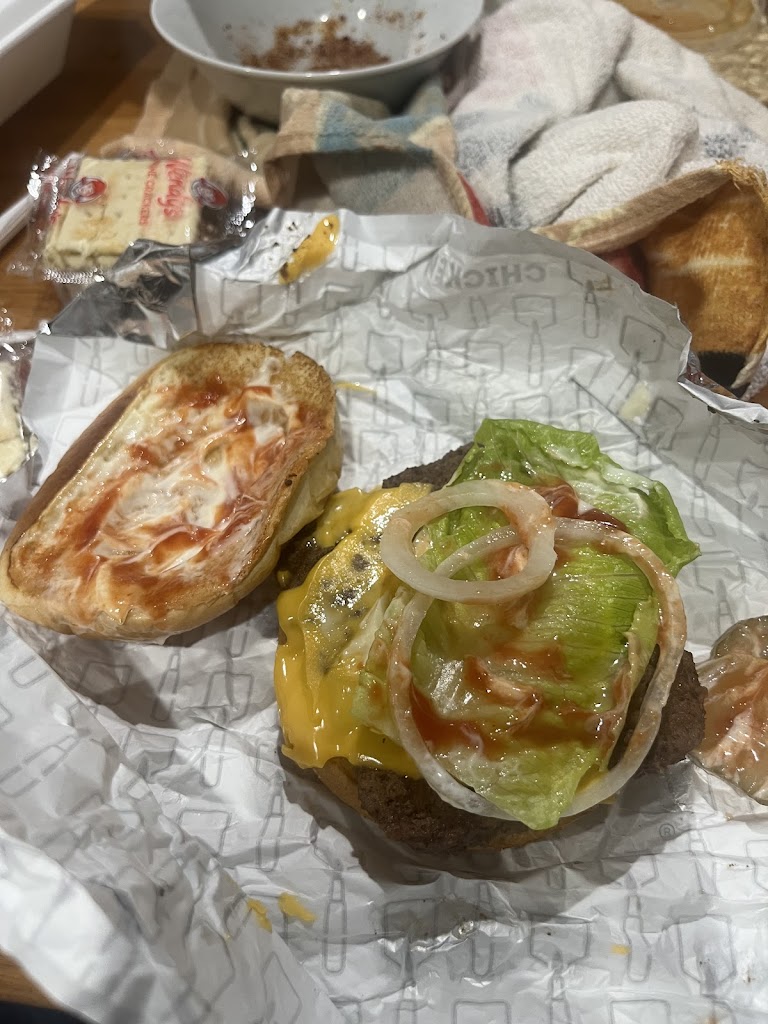 The food was good and hot I had the Dave classic single. It was juicy and good.