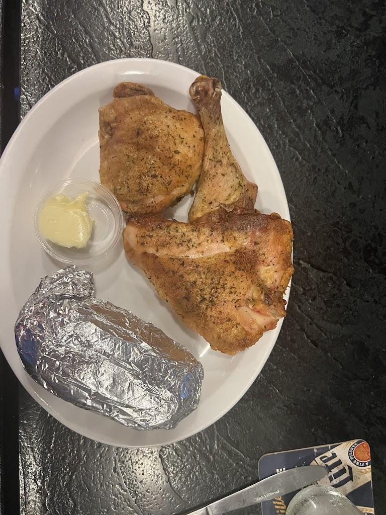 I saw a few hater reviews but the chicken was fantastic, salad cold and fresh, baked potato hit a delicious….full plate of food, really nice server/bartender super conversations around the bar. The bar is not dirty as some have said, it’s dark and has a pool table too.