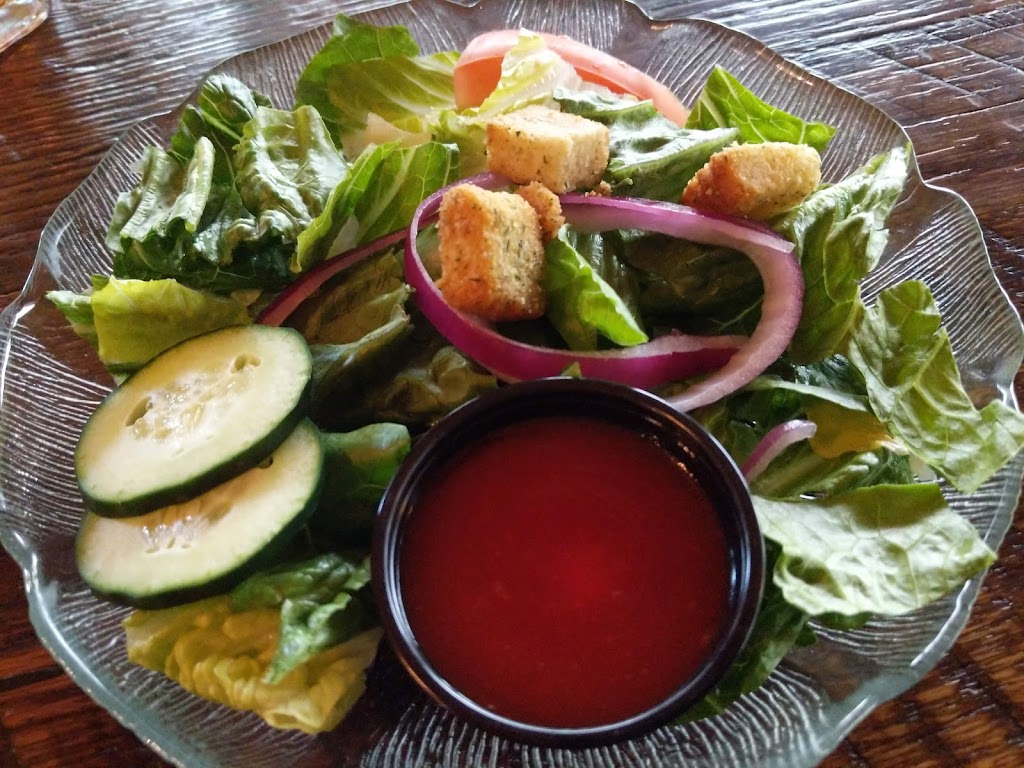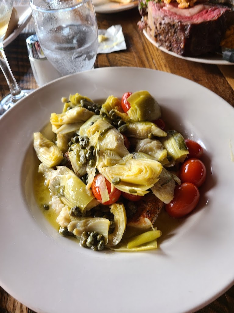 Three of us ordered the salmon. It was cooked unevenly, raw in the center for all of us, which means it either was cooked from frozen or wasn’t fully thawed. The plate also lacked vegetables, there were only a few leaves of spinach on the side along with marinated artichoke hearts from a jar.