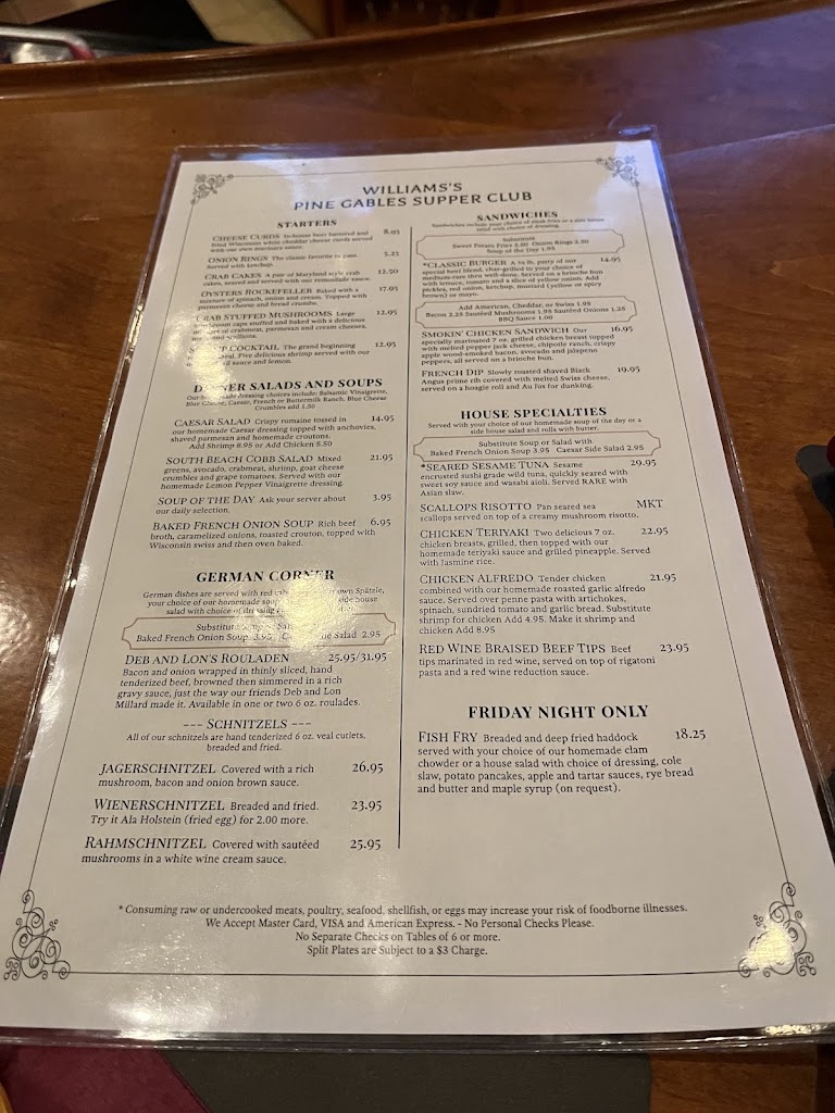 I dined here Saturday June 21st with my sister and Mom. Grace was our server and she was so lovely and very attentive. The Caesar Salad was perfectly crisp. My ribeye was expertly seasoned and cooked to a beautiful medium rare. The mushrooms on top were so flavorful. This is one of the best dinner experiences I've had in the Northwoods. I'm a private chef in the Milwaukee area and I definitely like to give credit where it is due! The place is spotless and so well-maintained. I'm very impressed, and will recommend William's Pine Gables to everyone.