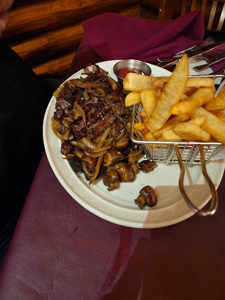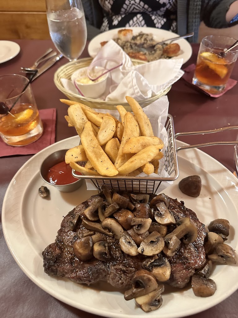 Food was fine. Not worth the $160 we spent but fine. Service great. The atmosphere is so sterile! All those beautiful wood walls with nothing to break it up! No pictures, plants, candles. Everything in burgundy. Curtains, floors, tablecloths, staff. I realize you may be trying to stay true to original supper club decor but need to add something! Black and white pictures of Eagle River. Old ice castle pictures . There are other more cozy restaurants with just as good food available.