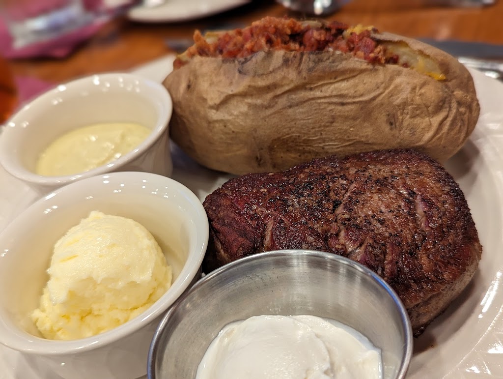 Went on a Wednesday, website says best to reserve, so we did, earliest opening was 7:15, this was 5 hours earlier. Got there at 6:30, huge bar, only 2 people sitting at it. Service was good, drinks were good. Tables open all over the place. Would not seat us till 7:15. Got to the table ordered and food can out. Baked potato was cold, would not melt the butter put on it. Wife and I got ribeye steaks, done perfectly to our liking. They were so salty we couldn’t eat them. For the price we paid, would not return.